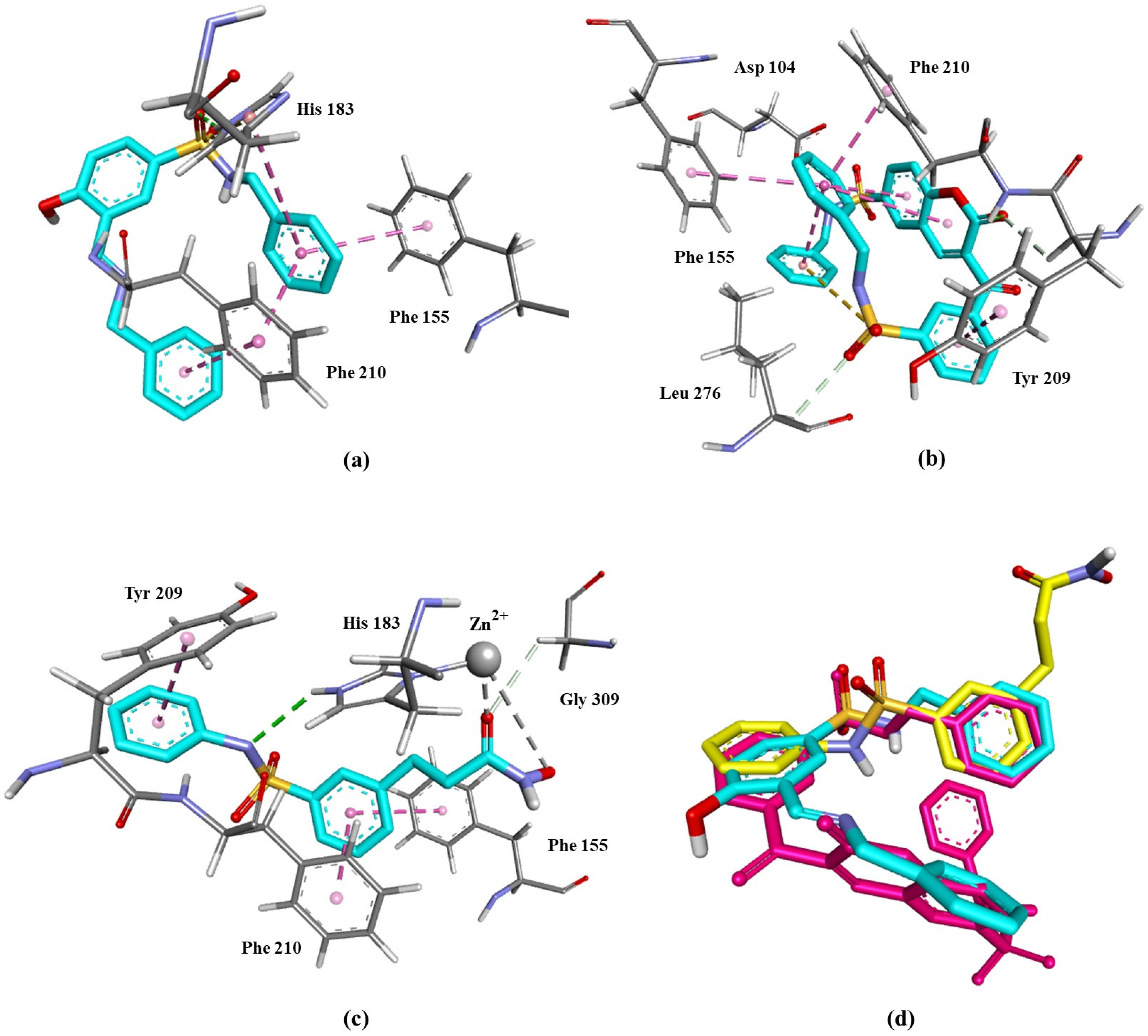 Compounds 1, 2, and belinostat all interact with the conserved Phe 155 and Phe 210 through parallel π–π interactions (Figure 10). Additionally, compound 1 interacts with His183, while compound 2 interacts with Leu 276 and Asp104 through hydrogen bonds. Both compound 2 and belinostat display parallel π–π interactions with Tyr 209. These interactions have been reported for other HDAC2 inhibitors [44,45,46]. As shown in Figure 10c, belinostat coordinates with the zinc ion in a bidentate manner, forming a five-membered chelate complex. Compounds 1 and 2 do not coordinate with the zinc ion; this is explained by the absence of the hydroxamate group. Molecular docking also shows that 1, 2, and belinostat have similar binding modes, allowing them to fit within the binding site similarly (Figure 10d). However, while belinostat penetrates deeply into the catalytic cavity of HDAC2 via its alkenyl hydroxamic acid group, compounds 1 and 2 show limited penetration. This is likely due to their rigid structures, which lack flexible linkers, and their large sizes relative to the narrow tunnel of HDAC2.