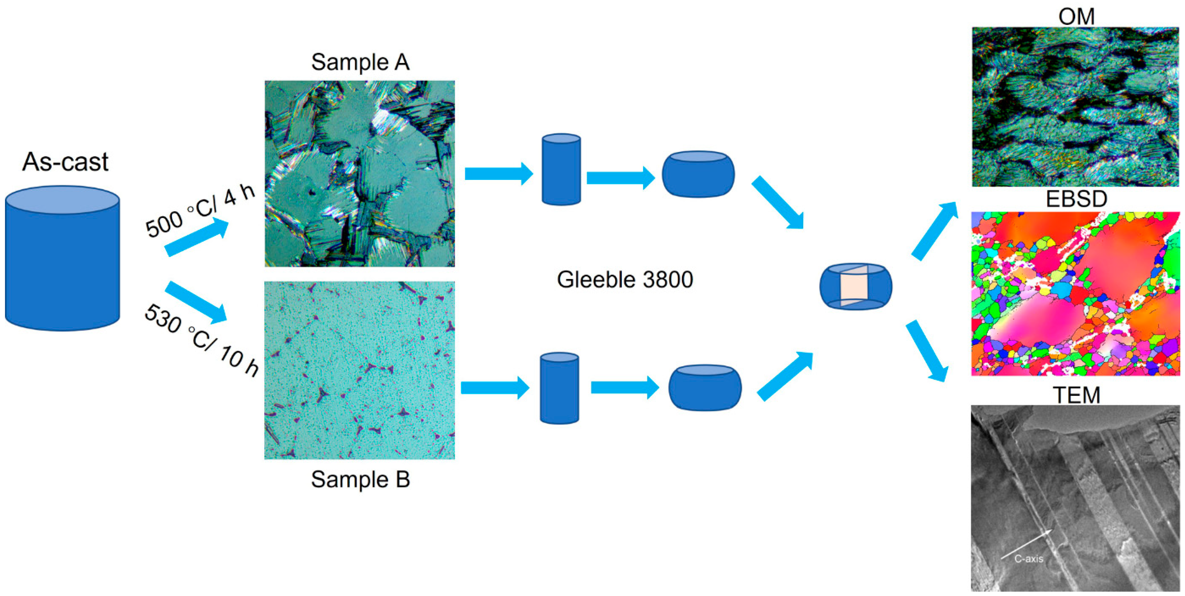 - Xue, Z.; Luo, W.; Zhao, Z.; Ren, Y. Thermal compression, processing maps and microstructural evolution of as-cast Mg-Gd-Y-Zn-Zr alloy with long period stacking ordered phase(Article). Mater. Res. Express 2020, 7, 056512. [Google Scholar] [CrossRef]