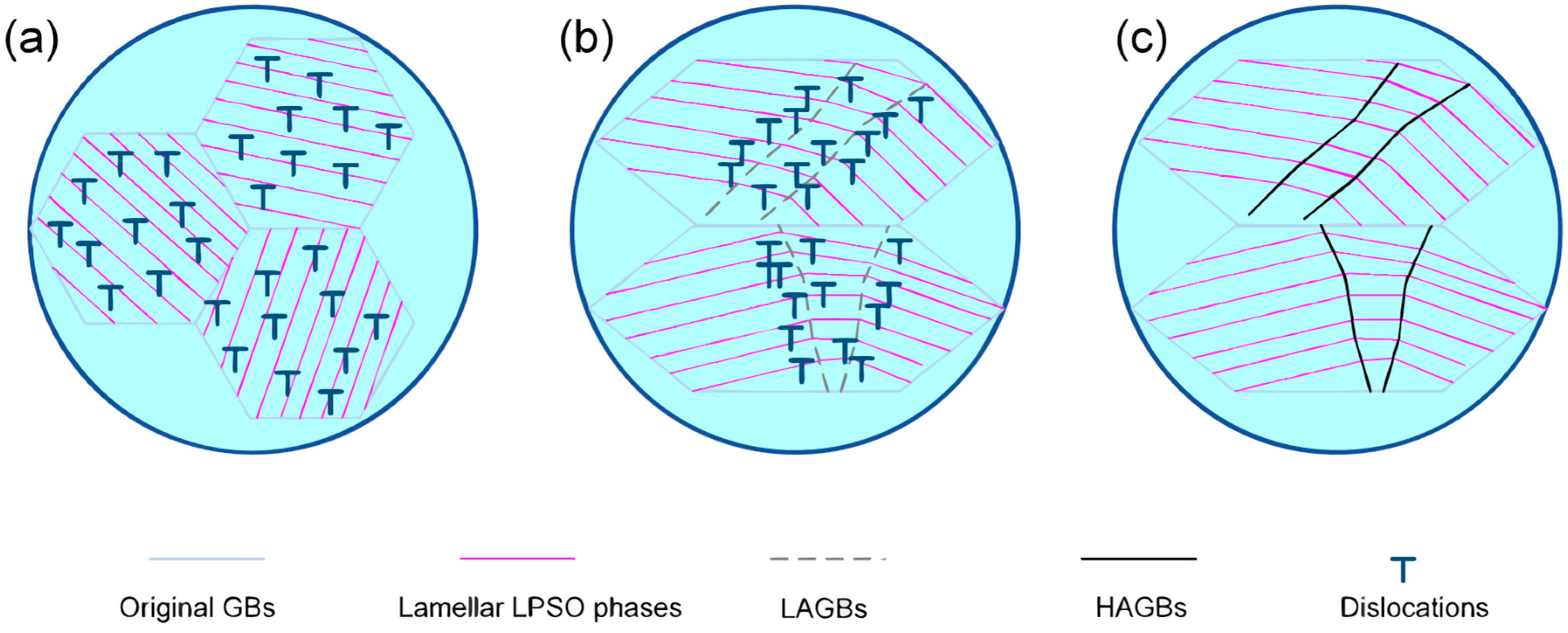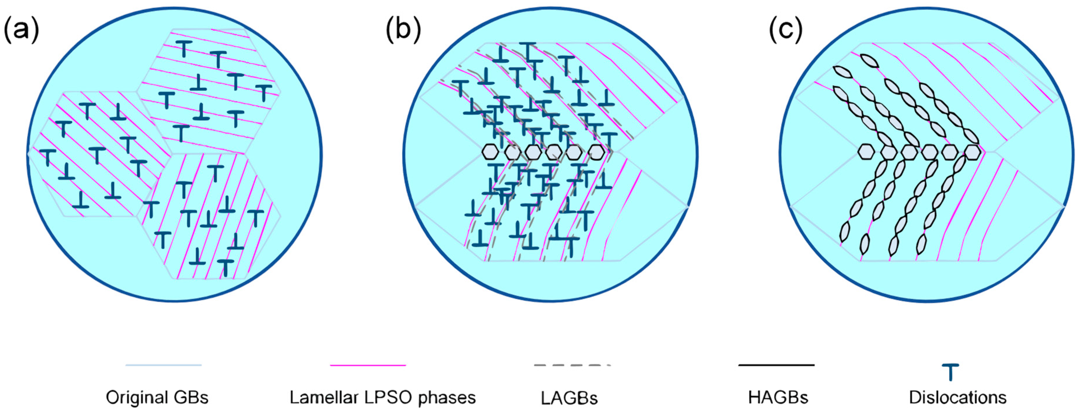 - Zhou, X.-J.; Liu, C.-M.; Gao, Y.-H.; Jiang, S.-N.; Han, X.-Z.; Chen, Z.-Y. Evolution of LPSO Phases and Their Effect on Dynamic Recrystallization in a Mg-Gd-Y-Zn-Zr Alloy. Metall. Mater. Trans. A 2017, 48A, 3060–3072. [Google Scholar] [CrossRef]