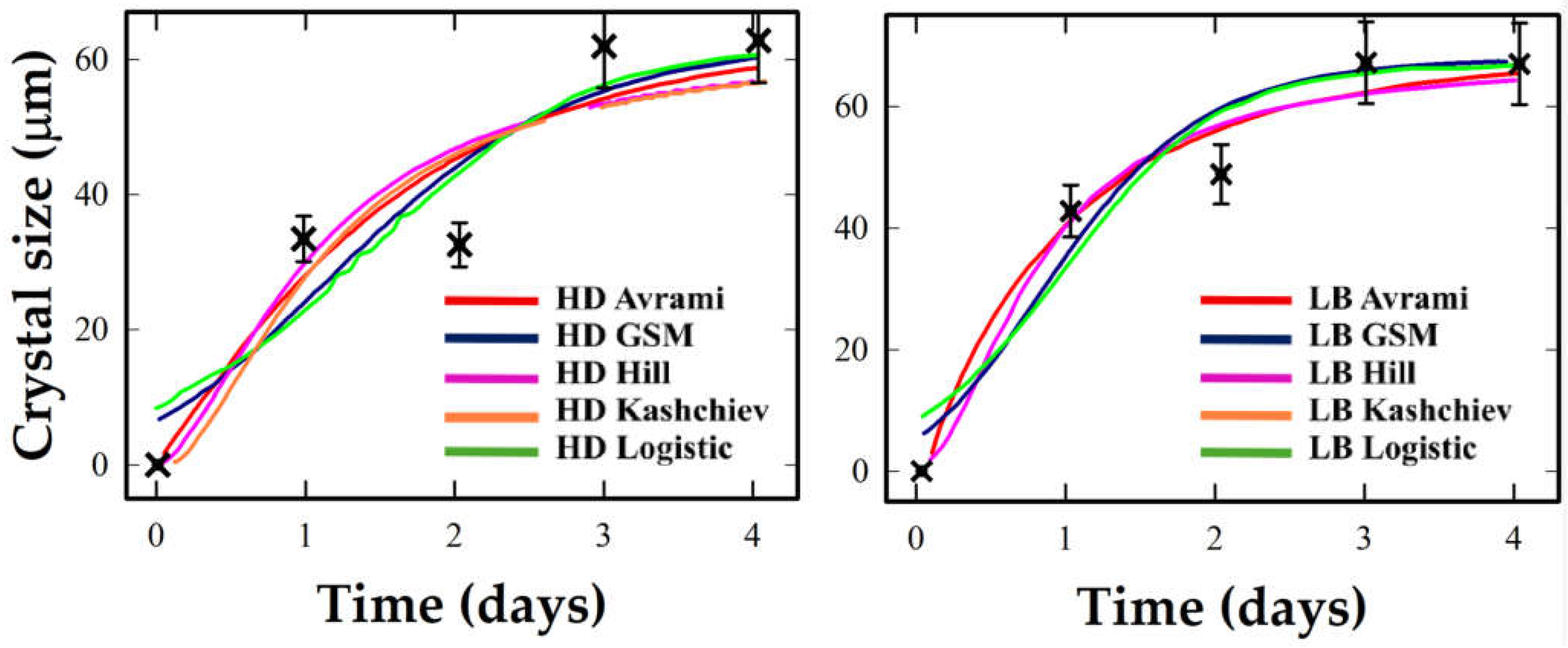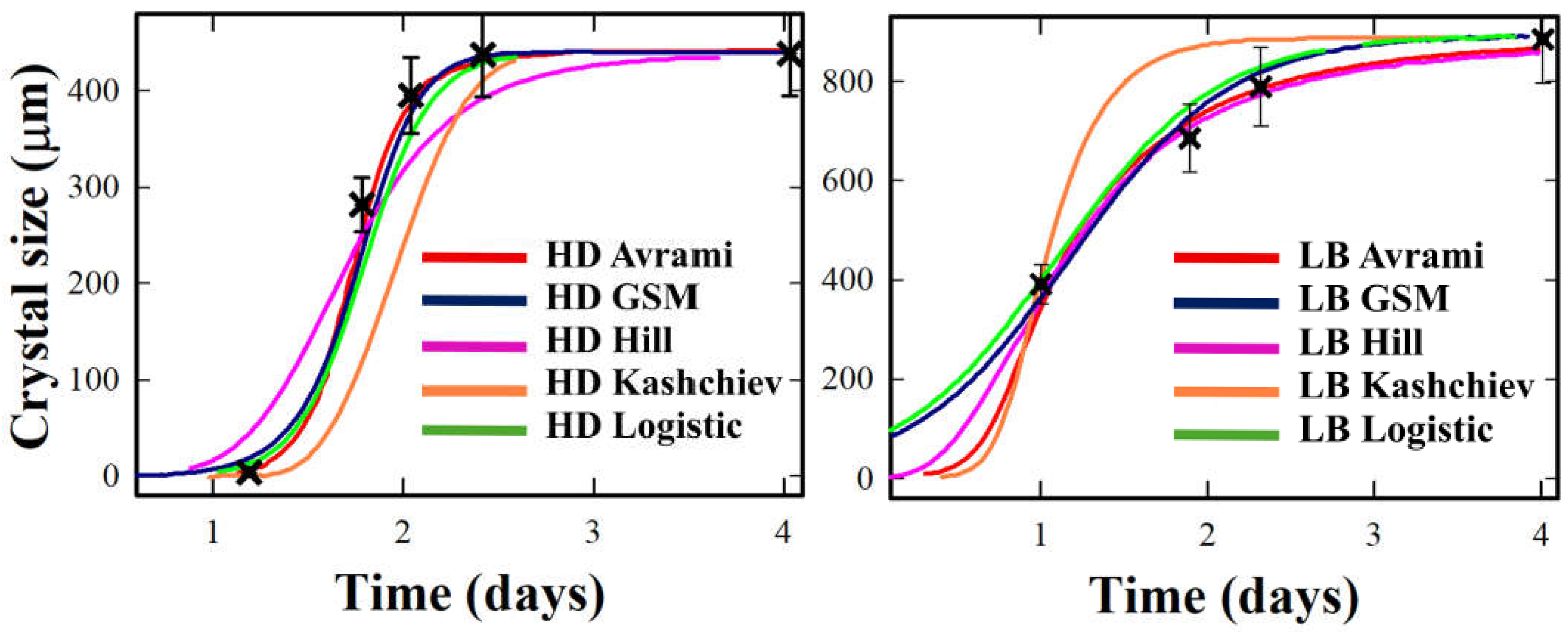| Kashchiev | k = 1.54, n = 2.96, τ = 1.178 | k = 3.426, n= 1.12, τ = 0.7979 | |