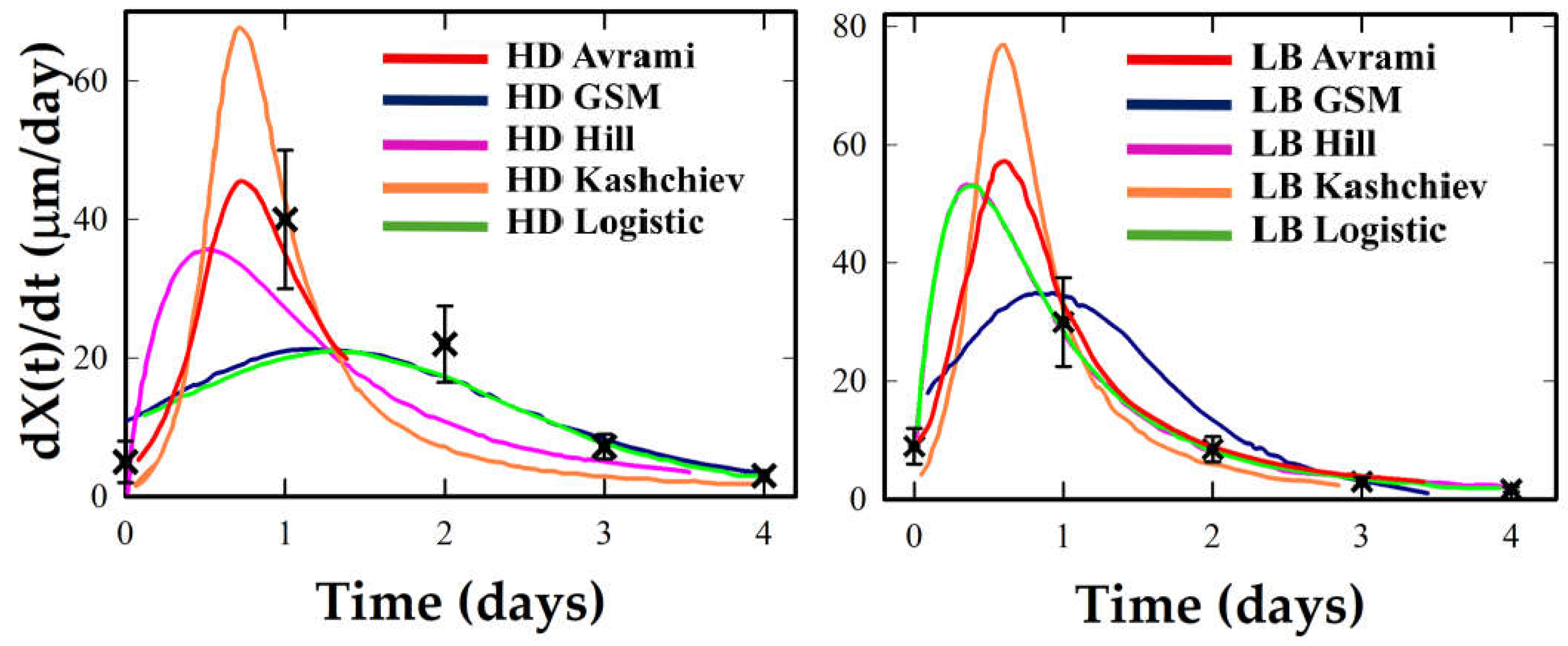 - Thaumatin: LB consistently increases growth rates and advances tmax, yet W1/2 remains wide, but (dX/dt)max rises strongly, indicating intensified but still temporally extended growth. This indicates acceleration without sharp temporal confinement, and model outputs agree closely.