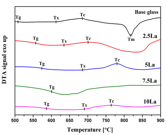 DTA curves of aluminosilicate glasses for the La-oxide series. Tg—the glass transformation temperature; Tx—the onset of crystallization temperature; Tc—the peak crystallization temperature; Tm—the melting temperature.