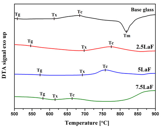 DTA curves of aluminosilicate glasses for the La-fluoride series. Tg—the glass transformation temperature; Tx—the onset of crystallization temperature; Tc—the peak crystallization temperature; Tm—the melting temperature.