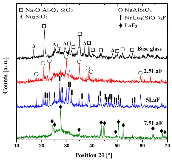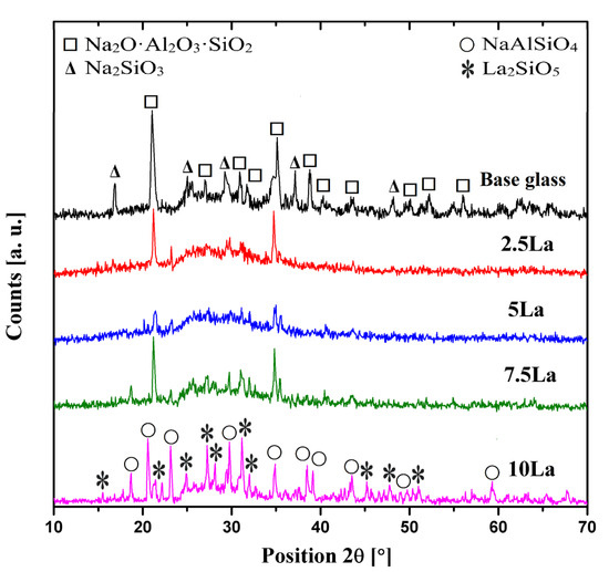 Figure 4 and Figure 5 show the diffraction patterns of the heat-treated glass samples. All glasses were crystallized at the maximum crystallization temperature determined from the DTA. In the base glass, two crystalline phases were identified: Na2O·Al2O3·SiO2 and Na2SiO3. Due to the high Na2O content in the glass, the first one crystallizes as the main phase. This results from the strong affinity of sodium ions for aluminum and their role in compensating the charge deficiency of Al3+ in the [AlO4] tetrahedron. The remaining sodium acts as a network modifier, breaking the oxygen bridges between [SiO4] tetrahedra. During the crystallization process, this leads to the formation of sodium silicate. In the 10 La sample, two different crystalline phases were identified: NaAlSiO4 and La2SiO5. NaAlSiO4 (nepheline) exhibits a zeolite-like structure based on a three-dimensional tetrahedral network of [SiO4] and [AlO4] units [20], with Na+ ions occupying interstitial sites within the framework. La2SiO5 is of particular interest due to its well-known application as a host matrix for rare-earth dopant ions such as Eu3+, Ce3+, Tb3+, and Dy3+ [21,22], which impart photoluminescent properties. For example, La2SiO5:Eu3+ is a widely studied red phosphor used in LED technologies and display screens [18]. For the glass-ceramic 2.5 LaF and 5 LaF samples were observed to have crystallization of the NaAlSiO4 and NaLa4(SiO4)3F, respectively. The latter belongs to the apatite group. Apatite structures are known for their flexible crystal frameworks, allowing for extensive ionic substitution, making them attractive for applications in optics [23], ceramics [24], biomaterials [25], and as phosphor hosts [26]. The silicate units [SiO4]4− form a stable tetrahedral backbone, while La3+ and Na+ occupy highly symmetric crystallographic sites. This structure facilitates the incorporation of various ions, especially rare-earth elements (e.g., Eu3+, Ce3+, Tb3+, and Sm3+), making this apatite a promising host for optically active ions. Finally, in the sample labeled 7.5 LaF, lanthanum fluoride (LaF3) was identified as the only phase present. Thus, for this glass, a low-phonon phase can be obtained through controlled crystallization. Increasing the amount of LaF3 in the glass batch composition leads to spontaneous crystallization of LaF3 during melt cooling.