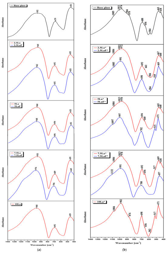 For silicate glasses, the position of the Si–O–Si band, typically observed around 1100 cm−1, varies depending on the type and concentration of network-modifying cations (Na+, Ca2+, and La3+) [28,29]. In our samples, this band appears as a right-hand shoulder of the main absorption band. Silicate glasses generally exhibit higher wavenumber values compared to aluminosilicate glasses [30]. The introduction of modifiers in the form of oxides (e.g., Na2O and CaO) also leads to the appearance of bands at lower wavenumbers, attributed to symmetric stretching vibrations of terminal Si–O bonds [31,32]. The presence of a band near 980 cm−1 is characteristic of orthosilicates [33], while bending vibrations typically appear around 660 cm−1 [34], as observed in the spectra of the glass-ceramics. With increasing La2O3 content—but not in the case of LaF3—these bands become more pronounced.