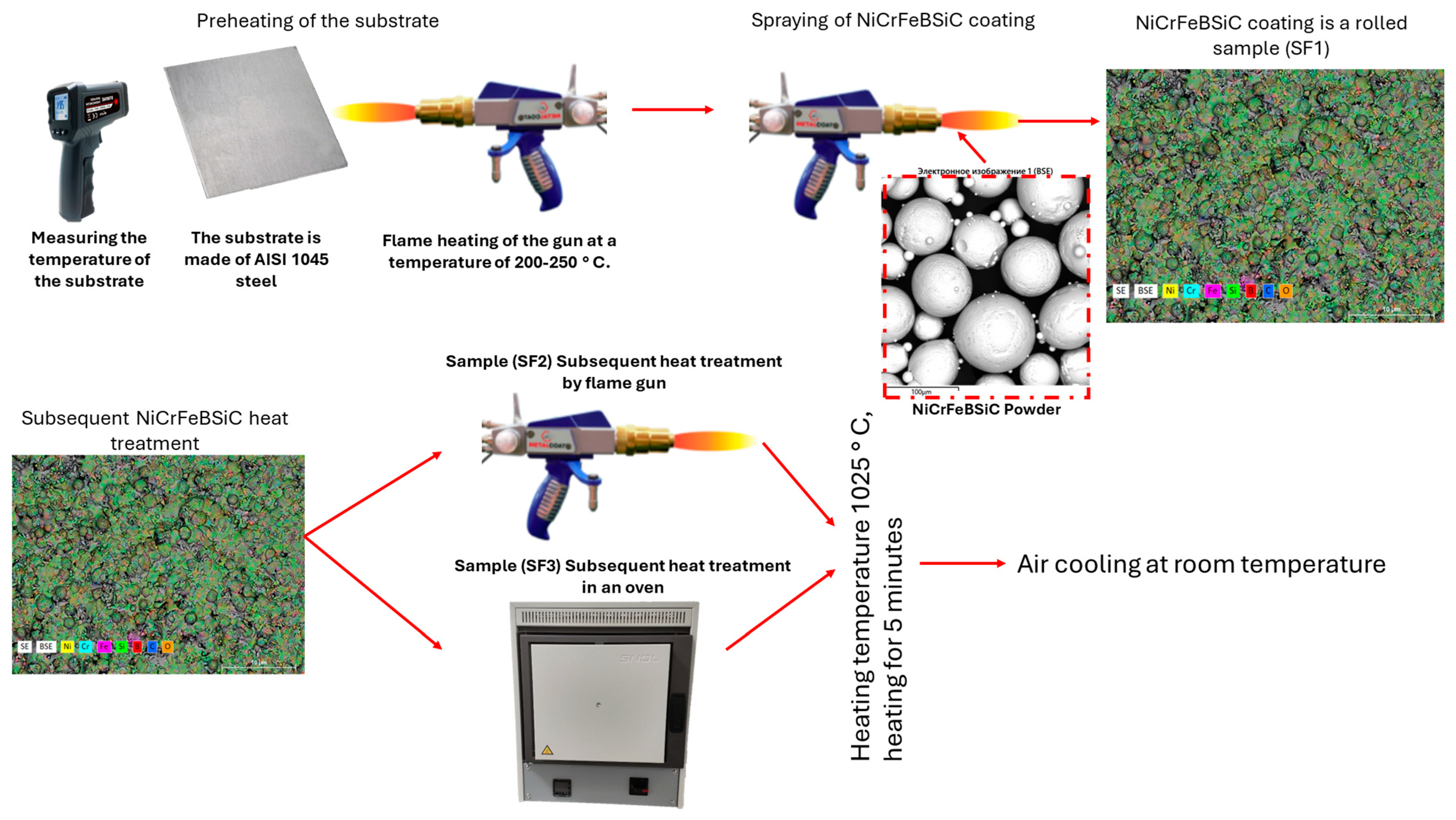 - Overall: Among the tested routes, furnace heat treatment at 1025 °C/5 min provides the best structure–property balance (minimum Ra and porosity, maximum HV and adhesion, low and stable μ, enhanced corrosion resistance) and is recommended to extend the service life of NiCrFeBSiC coatings under dry sliding.