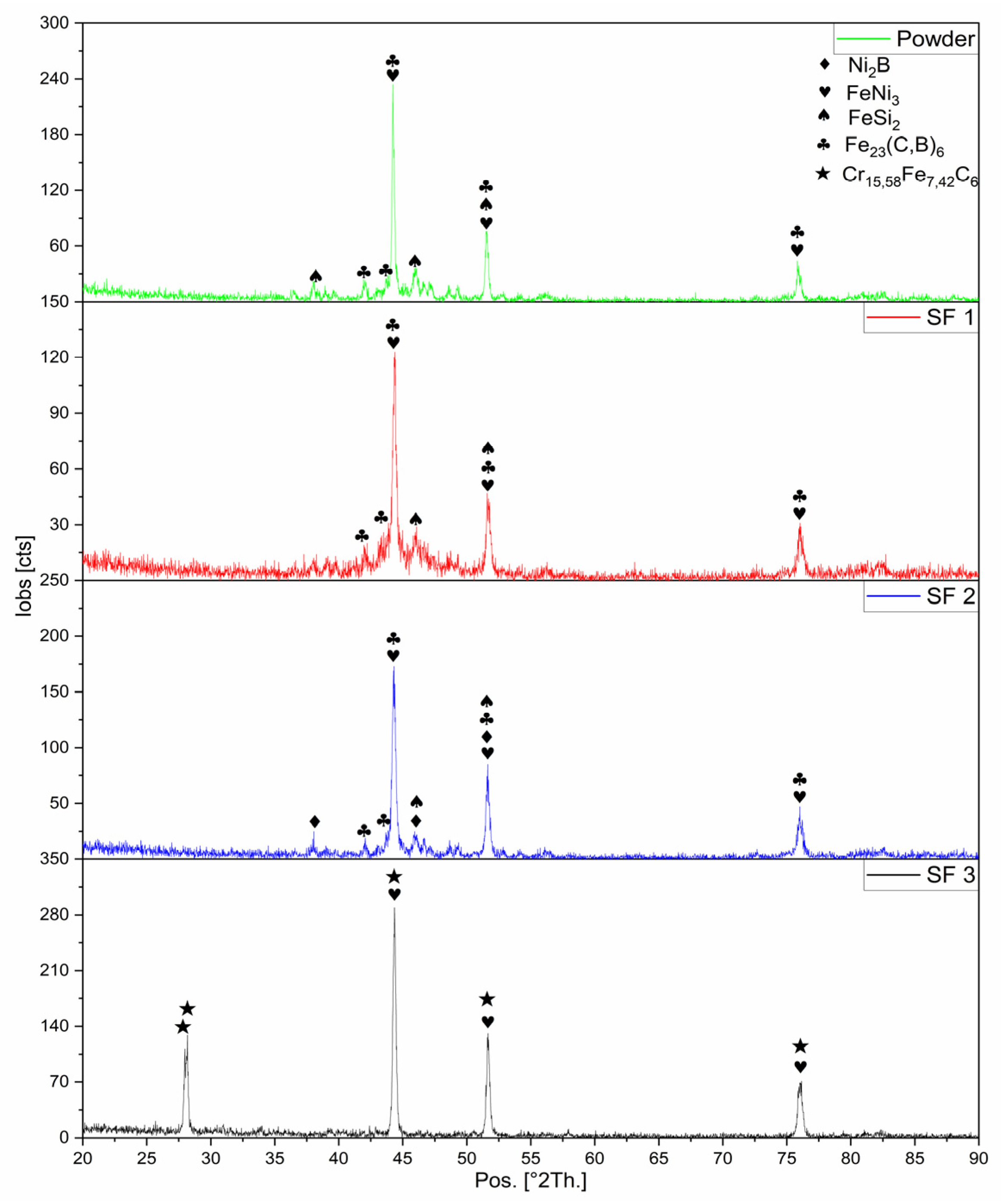 - The increase in intensity after flame remelting compared to the sprayed layer may indicate the onset of crystallization and structural stabilization of the material. The flame remelting process leads to local heating of the coating, which promotes a more complete formation of crystalline phases. However, the intensity is still lower than that of the initial powder, indicating the presence of a considerable amount of amorphous or microcrystalline regions.