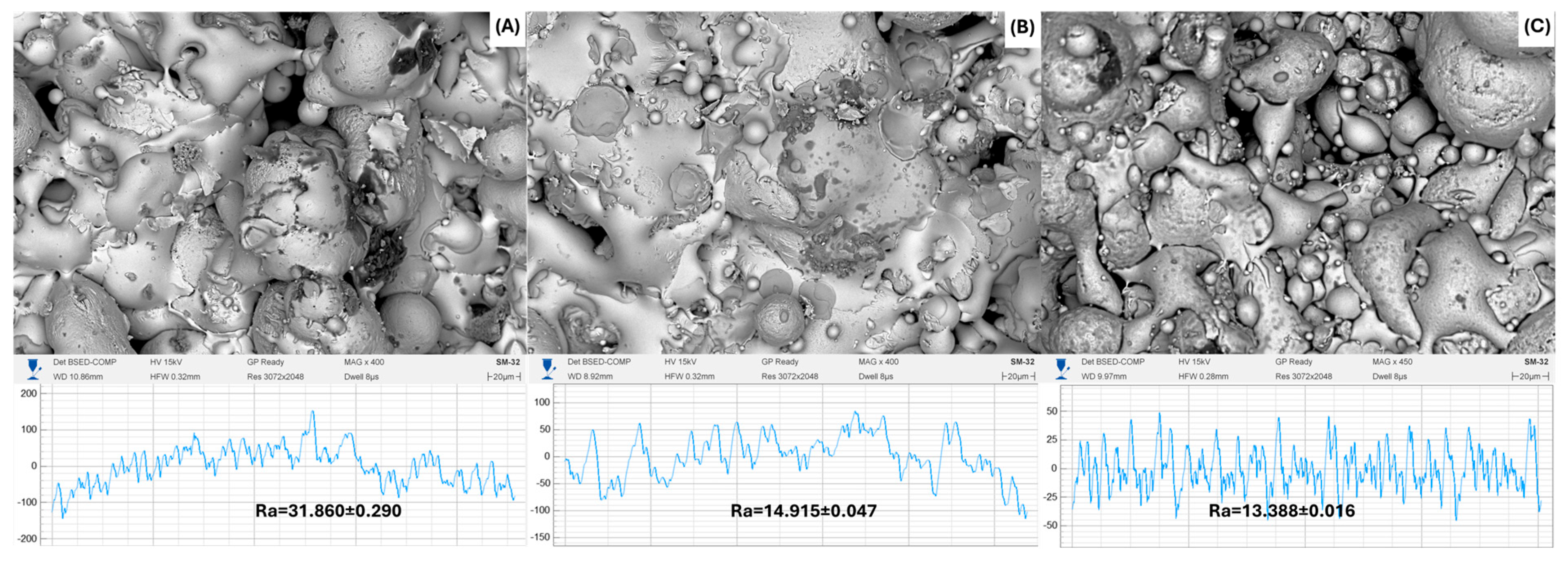 - Roughness (Ra): Surface smoothing with post-treatments: 31.860 → 14.915 → 13.388 μm (minimum after furnace treatment).