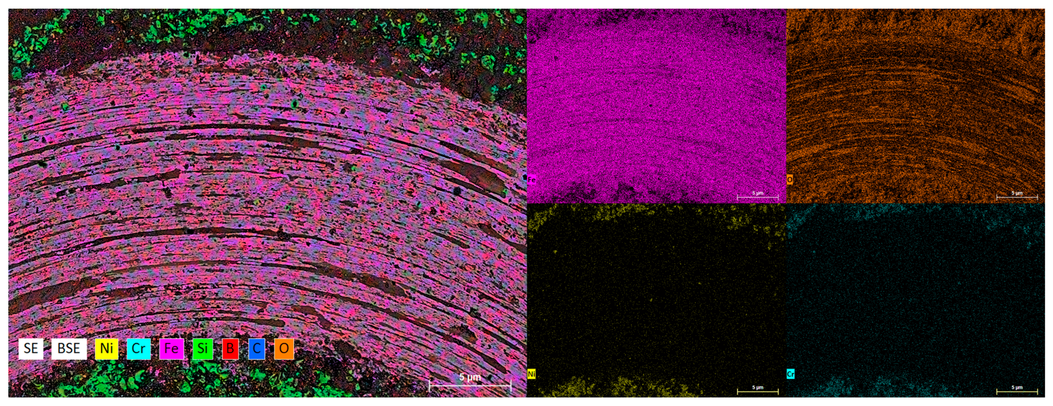 - Phase composition (XRD): The coatings contain FeNi3 and strengthening carbides/borides (e.g., Cr7C3, Fe23(C,B)6); after heat treatment, the lattice becomes more ordered with an increase in the Ni solid-solution lattice parameter (3.55 → 3.57 Å).
