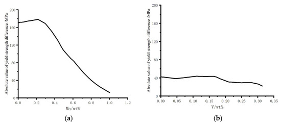 Similarly, the difference absolute value prediction diagrams of Mo, V, C, W, Si, Ta, N, Ti, and Mn component content and yield strength were established, respectively, and Mo, V, C, W, Si, and Ta were fixed as 0~200 MP, and the N, Ti, and Mn were fixed as 0~300 MPa. Figure 12a–i show the correlation relationships between the difference absolute value of Mo, V, C, W, Ta, N, Ti, and Mn component content and yield strength under 0 dpa and 20 dpa conditions.