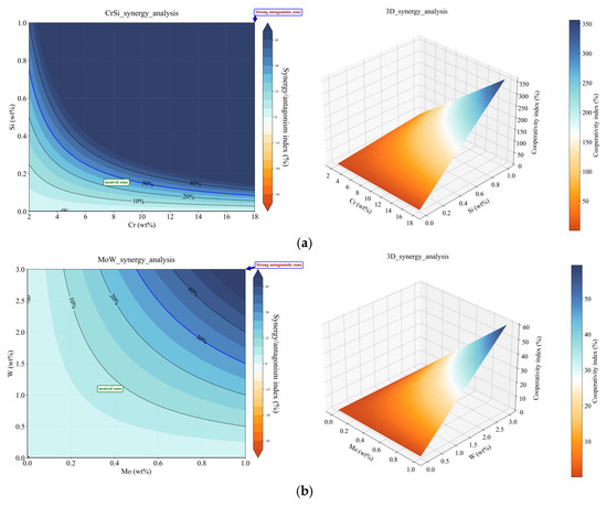 In addition, the machine learning analysis results of Cr-Si, Mo-W, N-Mn, Si-V, and Cr-Si are shown in Table 6, where an interaction strength of >0 is synergistic and <0 is antagonistic; the sum of the element contribution values = 100%.