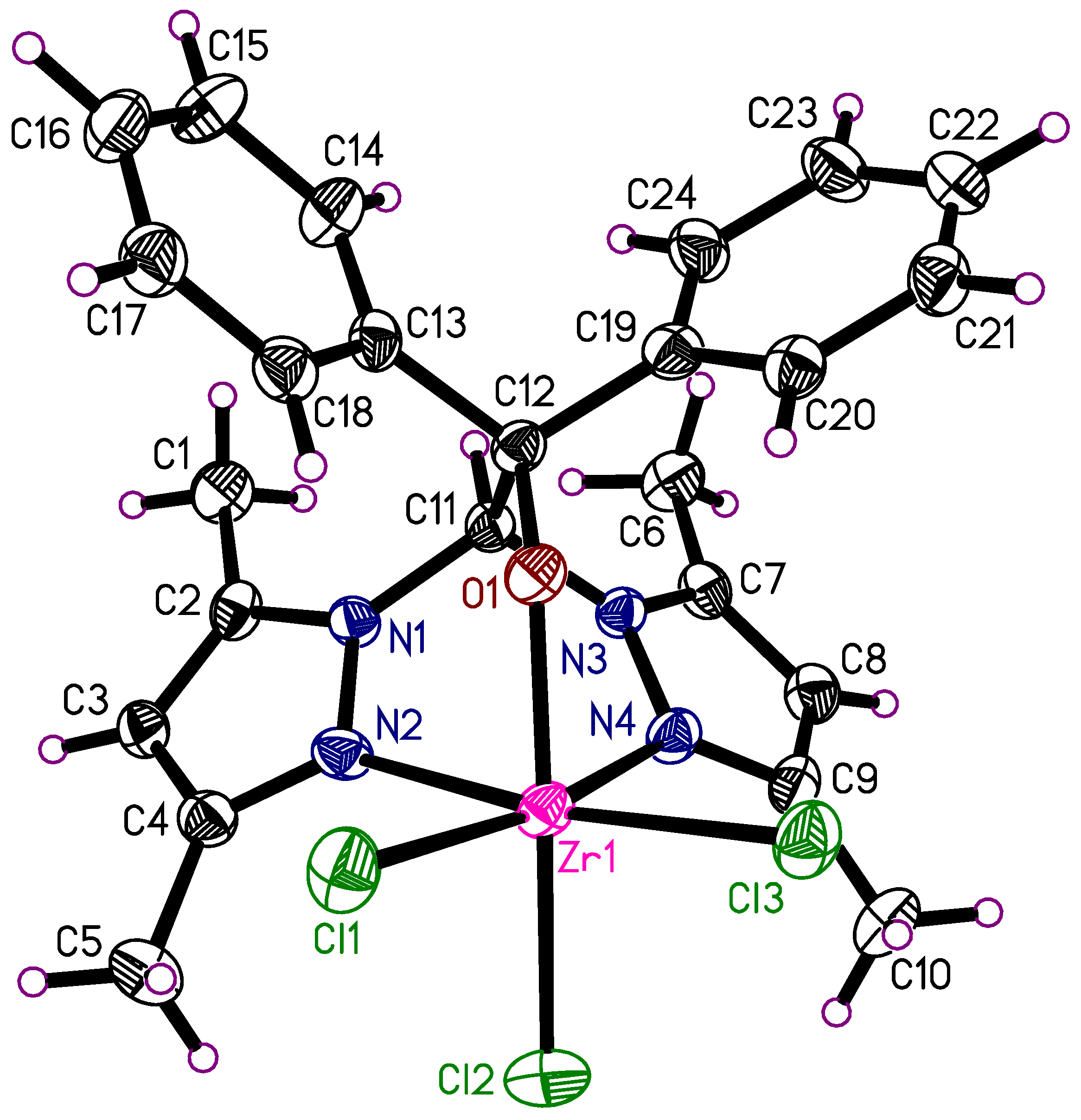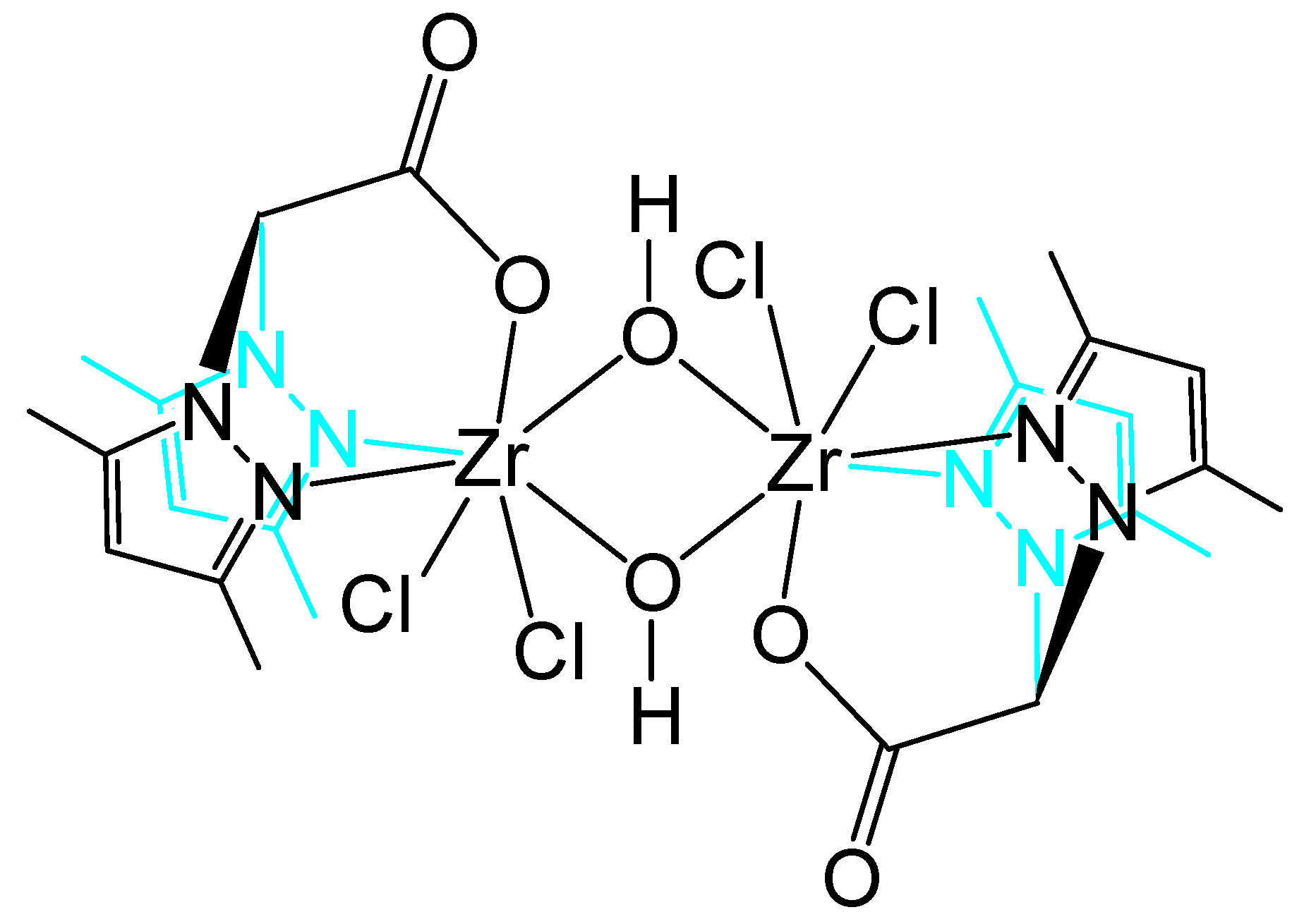 - Otero, A.; Fernández-Baeza, J.; Antiñolo, A.; Tejeda, J.; Lara-Sánchez, A.; Sánchez-Barba, L.; Fernández-López, M.; López-Solera, I. New Complexes of Zirconium(IV) and Hafnium(IV) with Heteroscorpionate Ligands and the Hydrolysis of Such Complexes To Give a Zirconium Cluster. Inorg. Chem. 2004, 43, 1350–1358. [Google Scholar] [CrossRef]