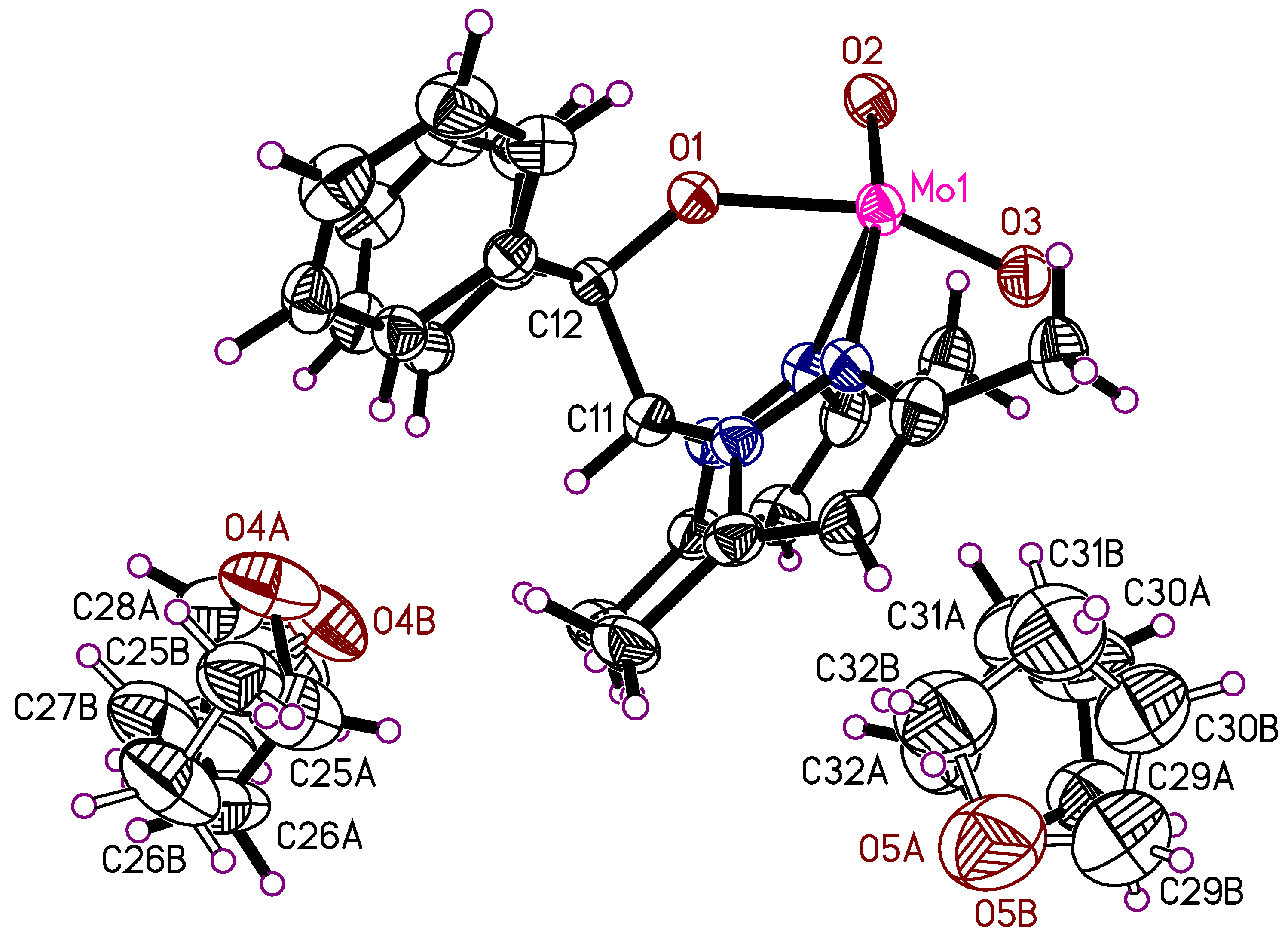 - Aguado, R.; Escribano, J.; Pedrosa, M.R.; De Cian, A.; Sanz, R.; Arnáiz, F.J. Binuclear oxomolybdenum(V) chlorides: Molecular structure of Mo2O4Cl2(DMF)4 and Mo2O4Cl2(bipy)2·DMF. Polyhedron 2007, 26, 3842–3848. [Google Scholar] [CrossRef]