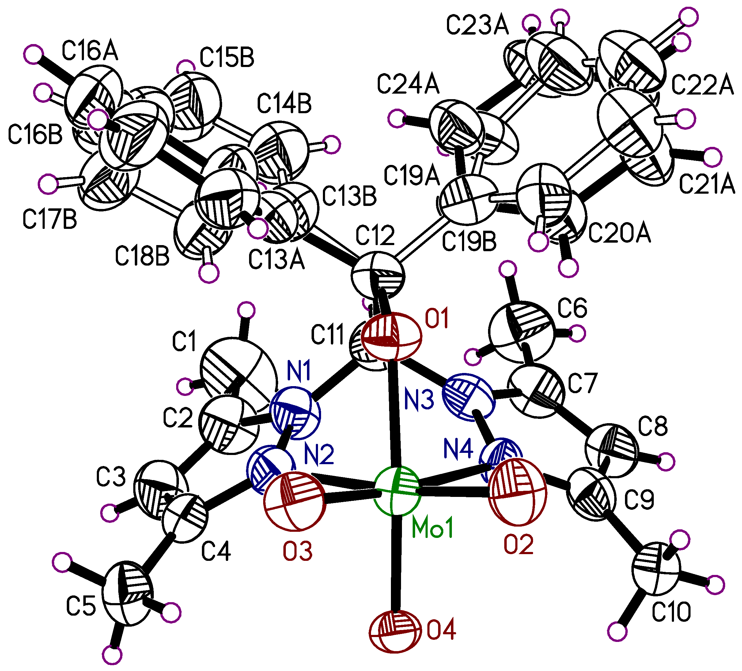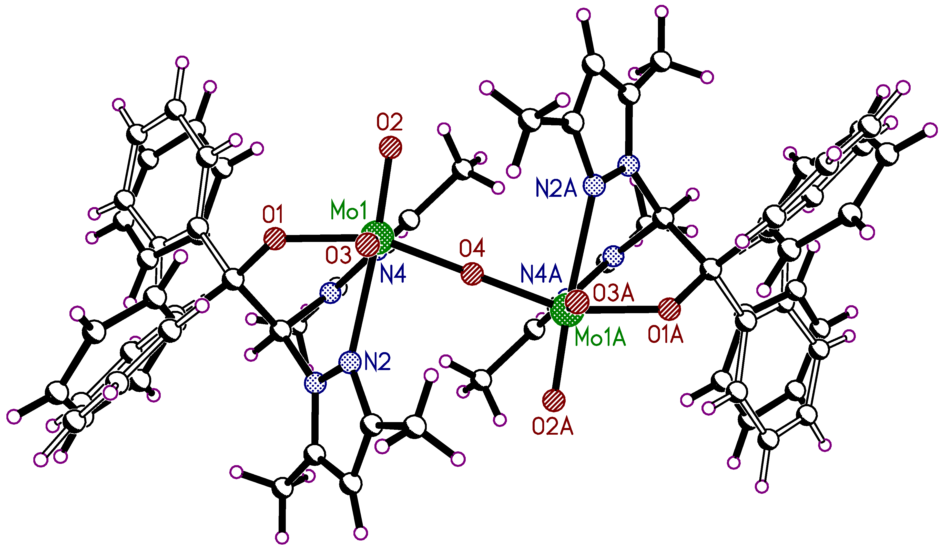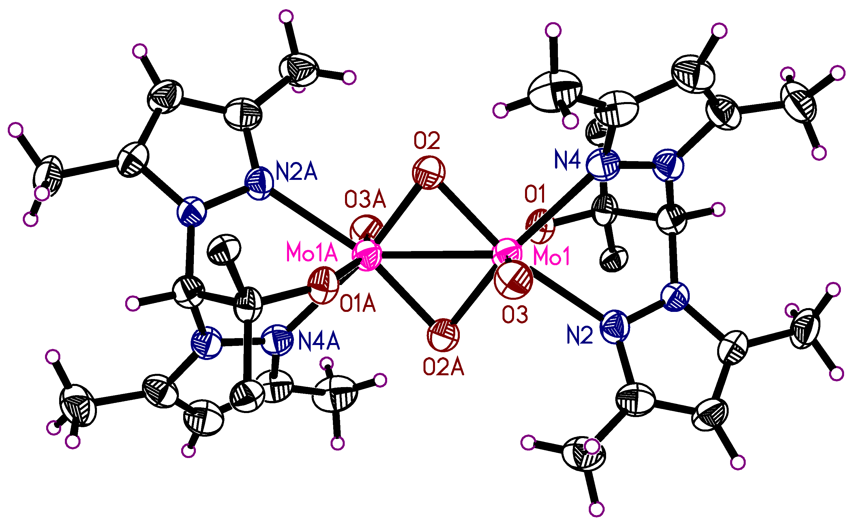 - Kitanovski, N.; Golobič, A.; Čeh, B. Syntheses and structural characterization of two novel oxygen bridged dinuclear Mo-complexes containing bdmpza as ligand, trans-[Mo2O5(bdmpza)2] and trans-[Mo2O3(NCS)2(bdmpza)2]·4CH3CN. Inorg. Chem. Commun. 2006, 9, 296–299. [Google Scholar] [CrossRef]