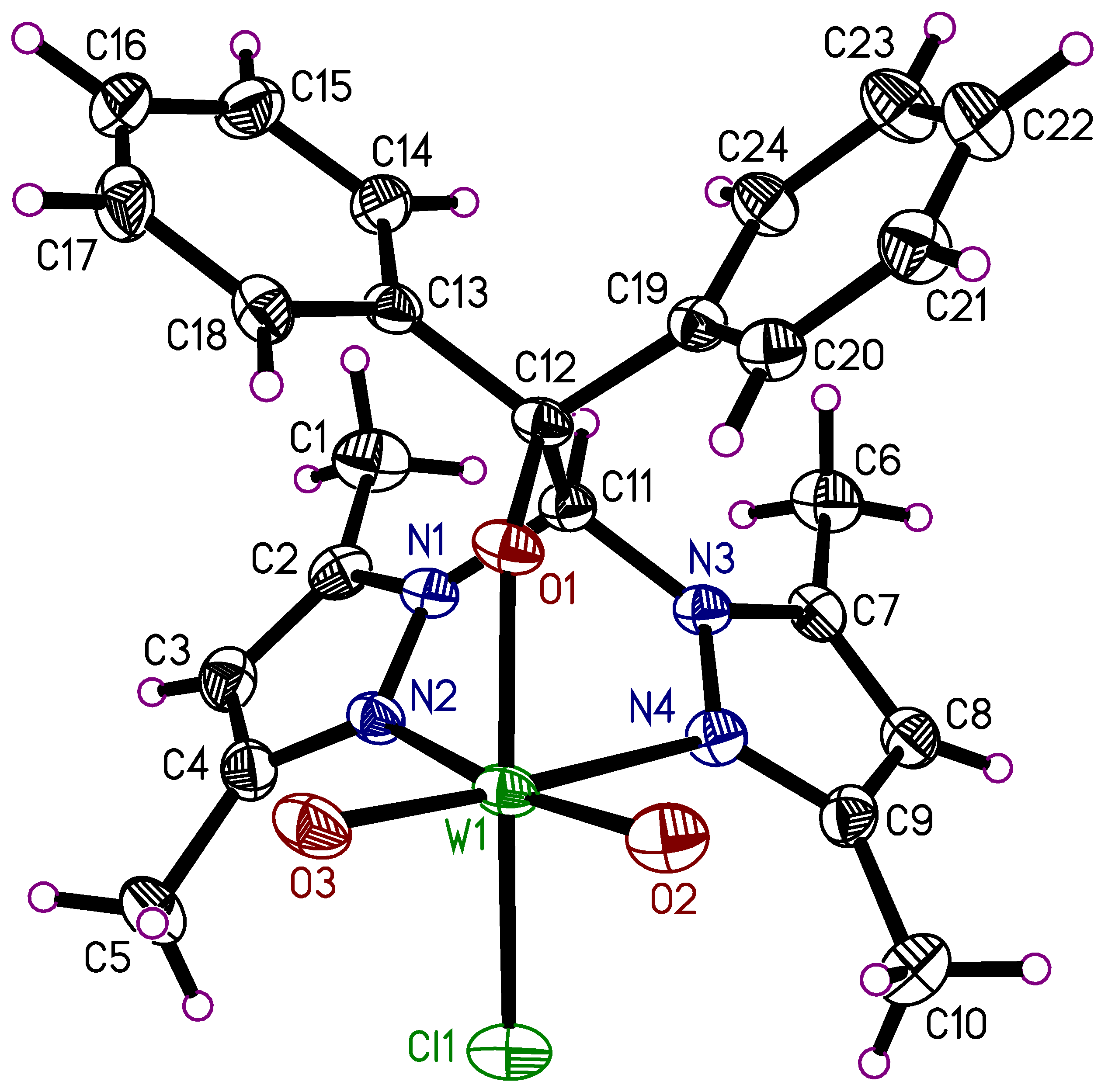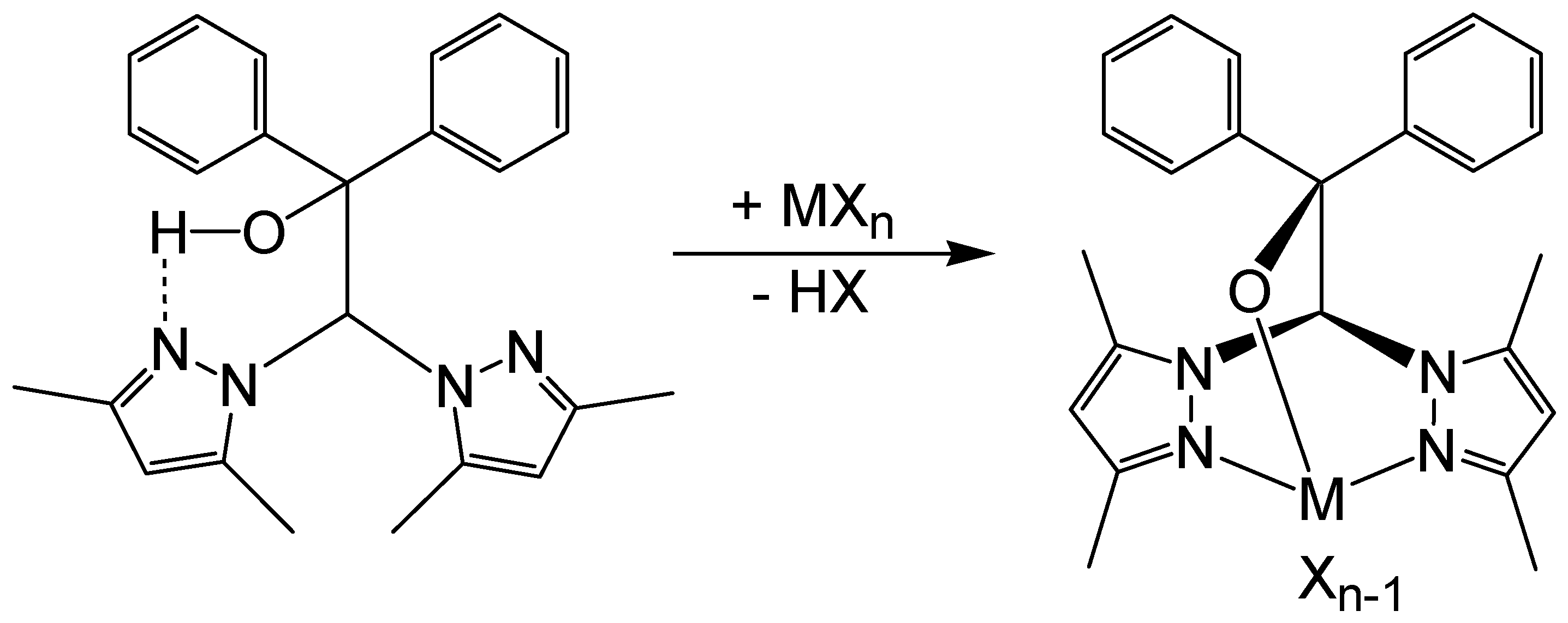 - Böhme, U.; Schwarzer, A.; Günther, B. The heteroscorpionate ligand 2,2-bis(3,5-dimethylpyrazol-1-yl)-1,1-diphenylethanol and an easy preparation of its tungsten complex. Acta Cryst. C 2019, 75, 996–1001. [Google Scholar] [CrossRef]