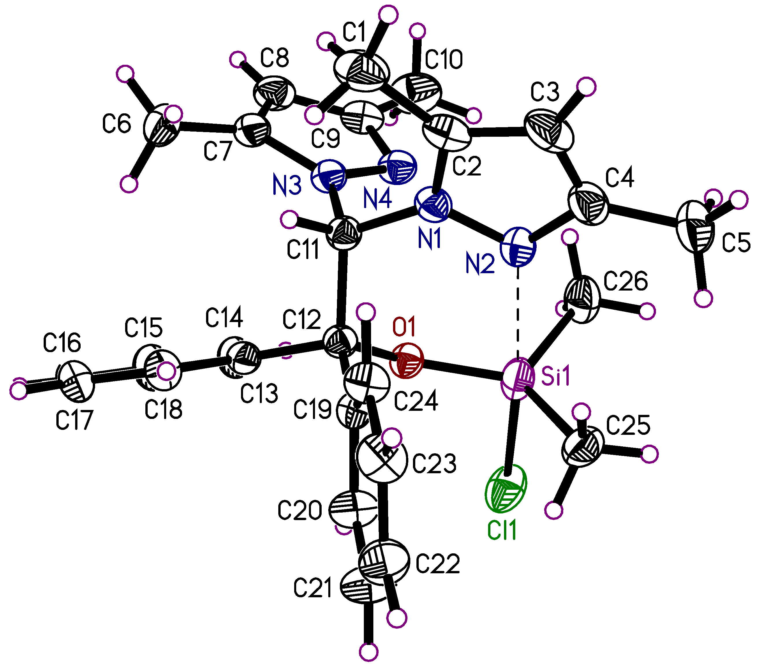 - Bitto, F.; Kraushaar, K.; Böhme, U.; Brendler, E.; Wagler, J.; Kroke, E. Chlorosilanes and 3,5-Dimethylpyrazole: Multinuclear Complexes, Acetonitrile Insertion and 29Si NMR Chemical-Shift Anisotropy Studies. Eur. J. Inorg. Chem. 2013, 2013, 2954–2962. [Google Scholar] [CrossRef]