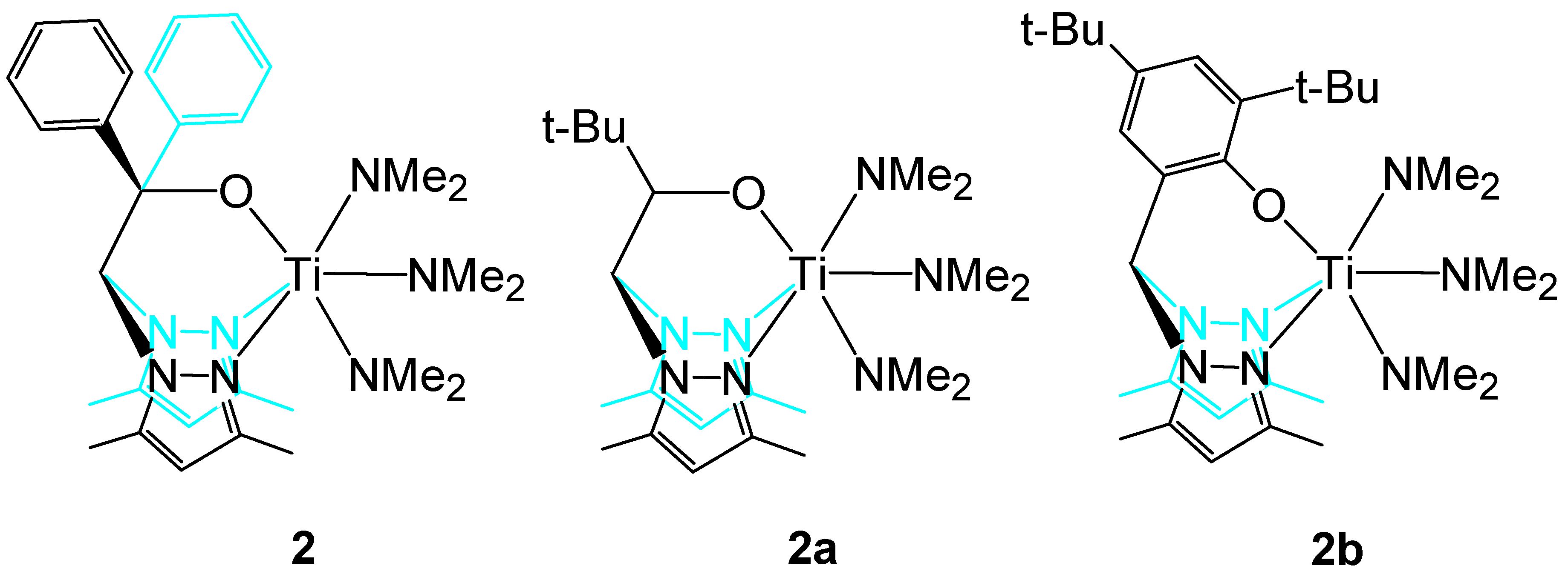 - Otero, A.; Fernández-Baeza, J.; Tejeda, J.; Lara-Sanchez, A.; Sanchez-Molina, M.; Franco, S.; Lopez-Solera, I.; Rodriguez, A.M. On the Search for NNO-Donor Enantiopure Scorpionate Ligands and Their Coordination to Group 4 Metals. Inorg. Chem. 2009, 48, 5540–5554. [Google Scholar] [CrossRef]