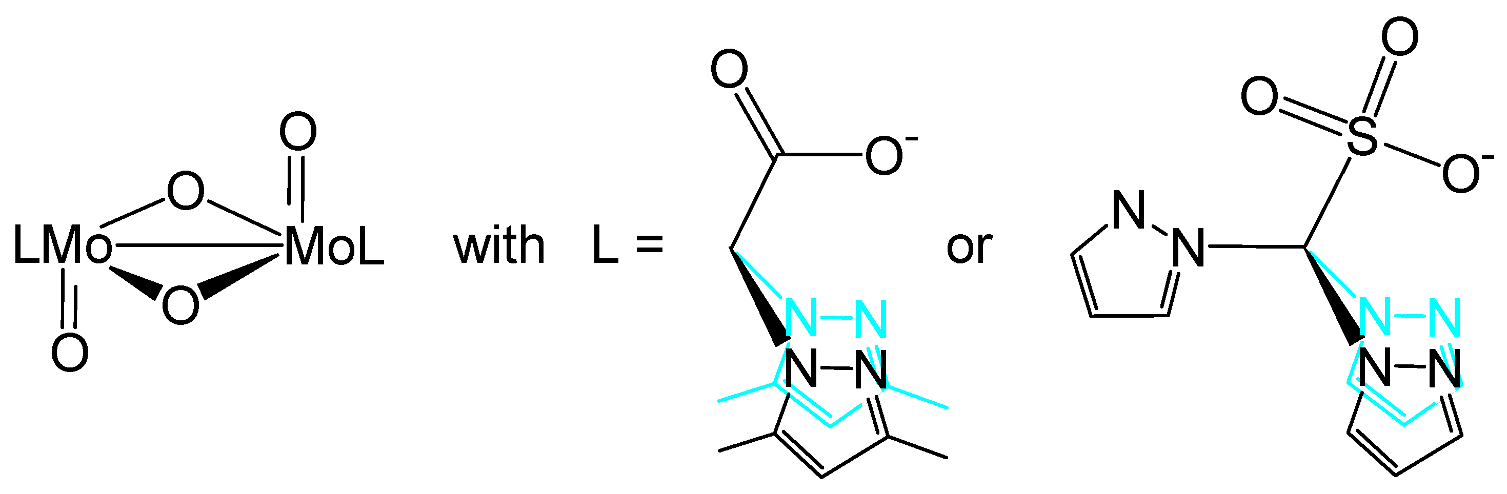 - Dinoi, C.; da Silva, M.F.C.G.; Alegria, E.C.B.A.; Smoleński, P.; Martins, L.M.D.R.S.; Poli, R.; Pombeiro, A.J.L. Molybdenum Complexes Bearing the Tris(1-pyrazolyl)methanesulfonate Ligand: Synthesis, Characterization and Electrochemical Behaviour. Eur. J. Inorg. Chem. 2010, 2010, 2415–2424. [Google Scholar] [CrossRef]