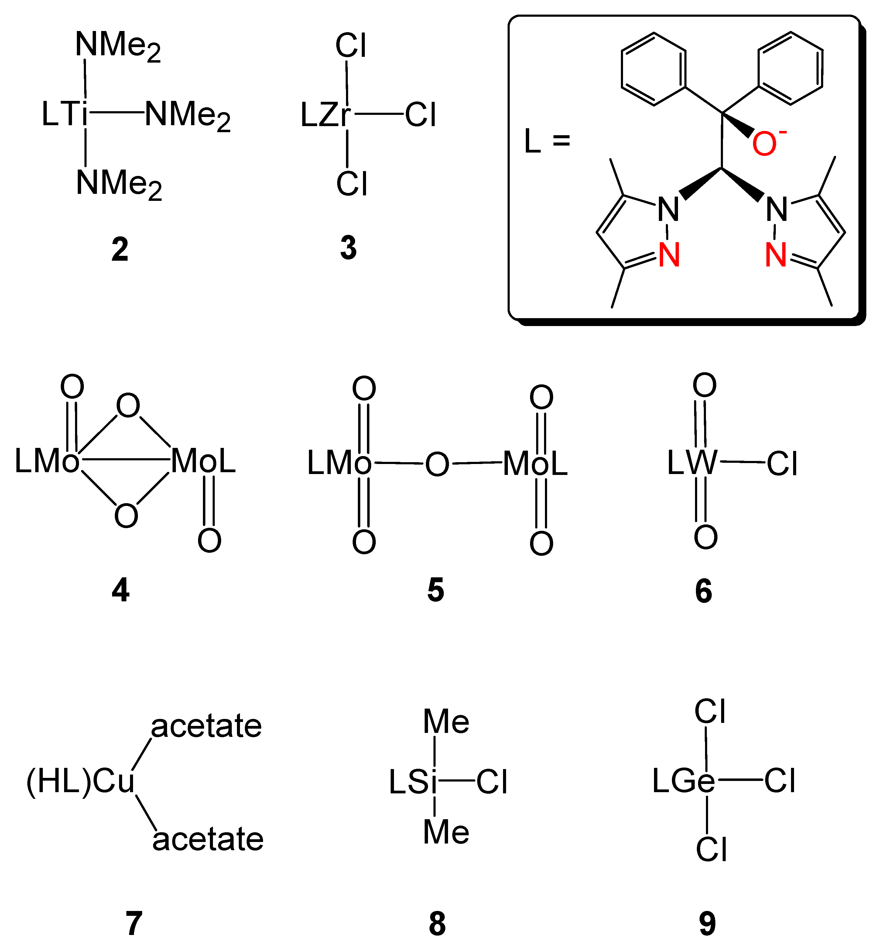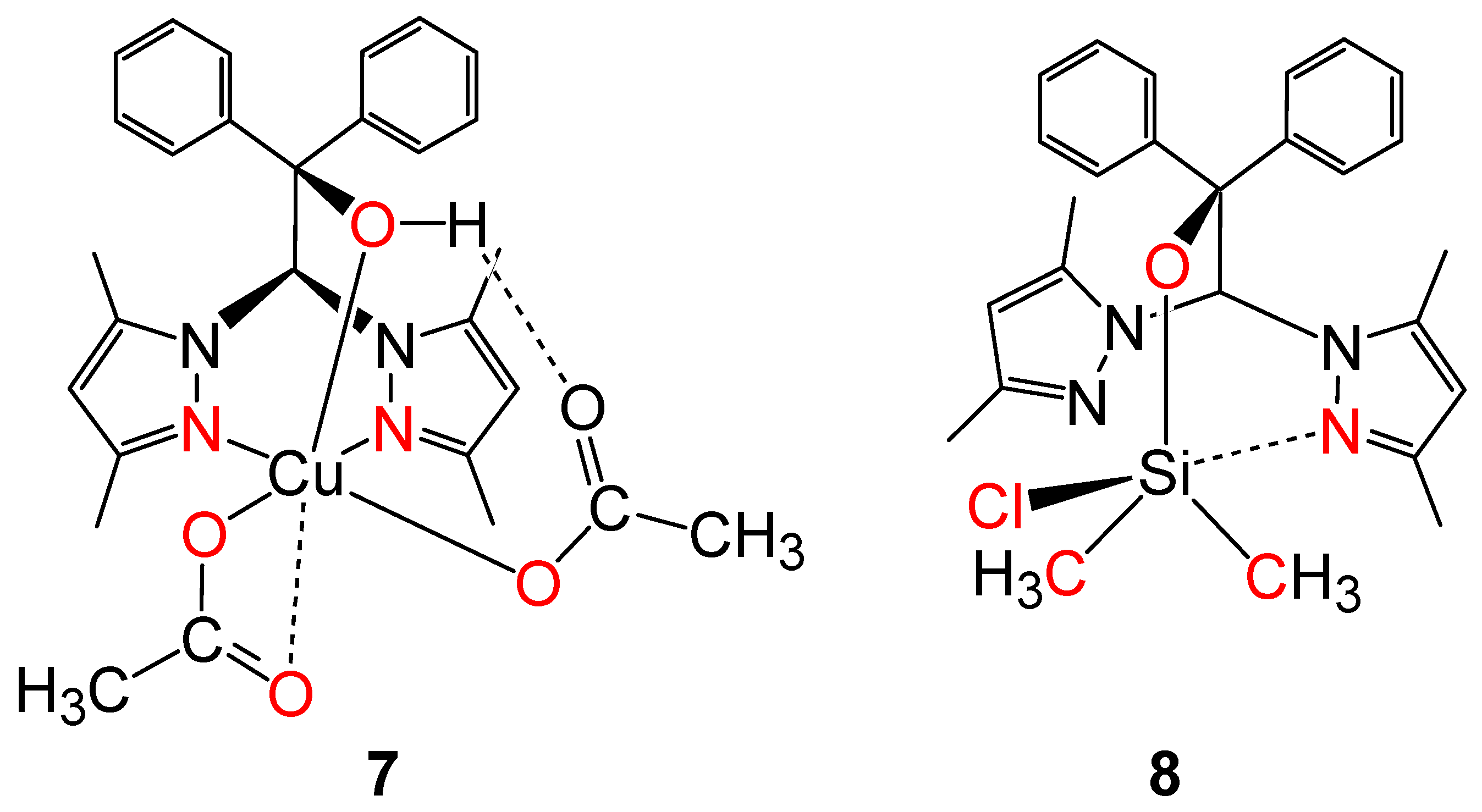 - Otero, A.; Fernández-Baeza, J.; Lara-Sanchez, A.; Tejeda, J.; Sanchez-Barba, L.F. Recent Advances in the Design and Coordination Chemistry of Heteroscorpionate Ligands Bearing Stereogenic Centres. Eur. J. Inorg. Chem. 2008, 2008, 5309–5326. [Google Scholar] [CrossRef]