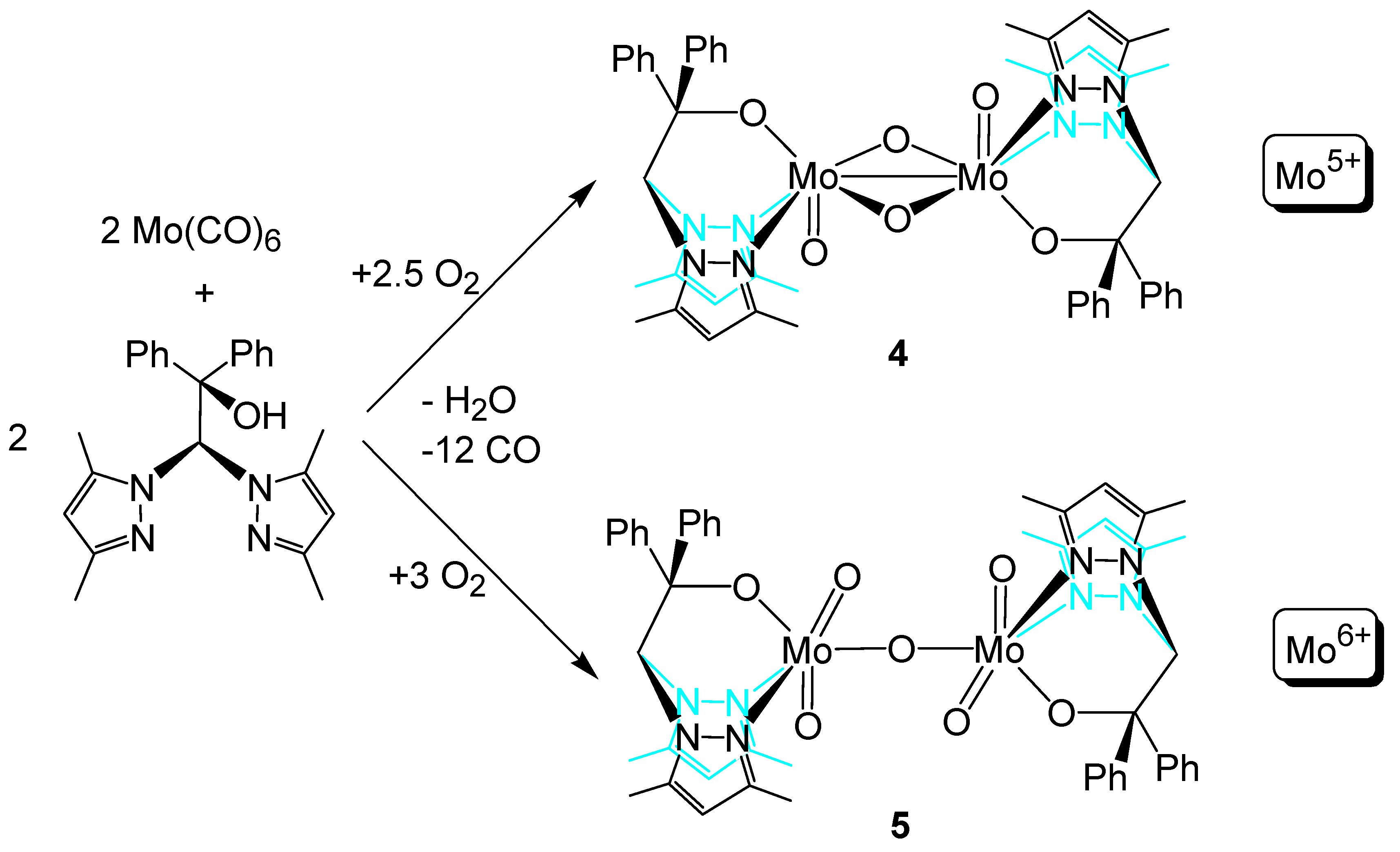 - Kitanovski, N.; Golobič, A.; Čeh, B. Synthesis and structural characterization of mono- and dinuclear Mo(V)-oxo-complexes containing bis(3,5-dimethylpyrazol-1-yl)acetate anion as ligand. Inorg. Chem. Commun. 2011, 14, 276–280. [Google Scholar] [CrossRef]