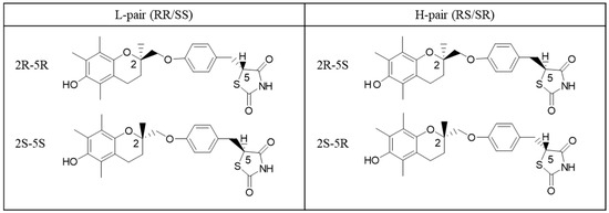Structural formulas of troglitazone stereoisomers (L-pair: RR/SS; H-pair: RS/SR).