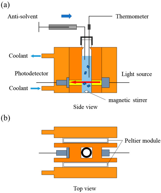 Schematic diagrams of the apparatus for detecting the nucleation induction period. (a) Side view; (b) Top view. The solution temperature is precisely controlled by a Peltier element, stirred with a magnetic stirrer, and monitored for both temperature and turbidity. The antisolvent is injected using a syringe pump to induce nucleation.