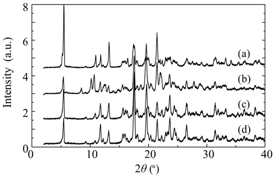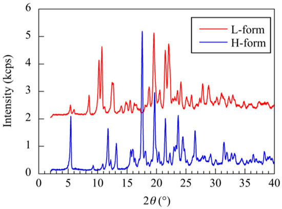 XRD analysis revealed a characteristic diffraction peak at 2θ = 8.7°, 10.4°, 10.9° for the RR/SS and at 2θ = 9.3°, 13.2°, 17.8° for the RS/SR in Figure 4. These peaks matched the XRD patterns of crystals reported in previous studies [18,19]. Therefore, hereafter, crystals composed of RR/SS are referred to as L-form, and those composed of RS/SR as H-form.