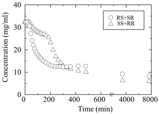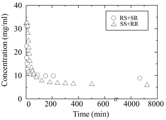 An acetone solution containing a mixture of troglitazone’s four isomers (RR, SS, RS, SR) at a concentration of 16 mg/mL each was prepared. This corresponds to an initial concentration of 32 mg/mL for the RR/SS and 32 mg/mL for the RS/SR. Antisolvent crystallization was then performed by adding water. Figure 5 shows the change in concentration over time during crystallization, starting from the moment of water addition. Triangles indicate the RR/SS, and circles indicate the RS/SR. Approximately 30 min after the addition of water, the concentrations began to decrease, indicating that nucleation from the supersaturated solution had occurred. In particular, the concentration of the RS/SR decreased rapidly within about 200 min after antisolvent addition. At the same time, the concentration of the RR/SS also decreased. The decrease in both concentrations, with the RS/SR showing a more pronounced drop, suggests that the crystals of both pairs precipitated simultaneously, but with different nucleation and growth rates.