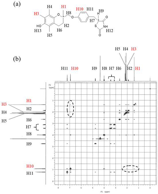NOESY spectrum of the RR/SS solution. RR/SS crystals were dissolved in acetone-d6. (a) Structural formula of troglitazone with hydrogen atoms numbered according to the 1D NMR spectrum from the upfield region. Asterisks (*) indicate the presence of chiral carbon centers. (b) NOESY spectrum of the solution. The dotted circle highlights the NOESY cross-peaks of interest.