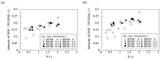 To investigate further, we measured the NOE (Nuclear Overhauser Effect) intensities between H1–H10 and H3–H10 of the troglitazone molecule under different saturation ratios and solvent compositions. For NOE measurements, saturation irradiation was applied to the H10 proton (chemical shift 6.896 ppm). Figure 10a,b show the saturation ratio (S) on the horizontal axis and NOE intensity on the vertical axis, with results obtained for RS/SR and RR/SS at solvent composition of water/(acetone + water) = 0.0, 0.1, 0.2, and 0.3, respectively.