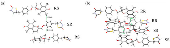 The crystal structures of both H-form and L-form have been determined, and their crystallographic data have been reported [18]. We compared these crystal structure data with the NOESY and NOE results, focusing on the interproton distances corresponding to the observed correlations (Figure 11a,b). In the H-form crystal structure, the interproton distance between H1 and H10 (between SR and RS molecules) was 2.304 Å, and that between H3 and H10 (between SR and RS molecules) was 2.384 Å. These distances are short, even among closely spaced intermolecular hydrogen atoms. In contrast, in the L-form crystal structure, the interproton distance between H1 and H10 was 3.334 Å (between RR and SS molecules), and that between H3 and H10 was 3.626 Å (between RR and RR molecules), both longer than in the H-form crystal structure.