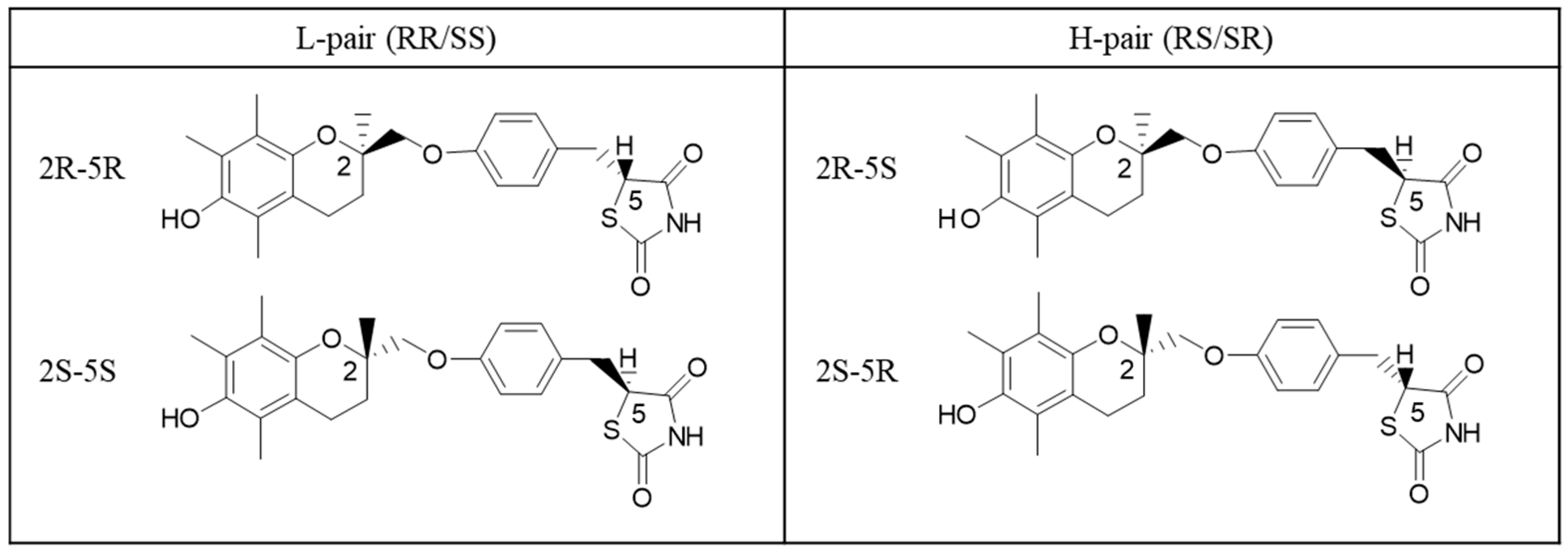 In this study, troglitazone, an antidiabetic drug with two chiral carbons, was selected as a model compound. Troglitazone has four stereoisomers: RR, SS, RS, and SR. According to the study by Kobayashi et al. [