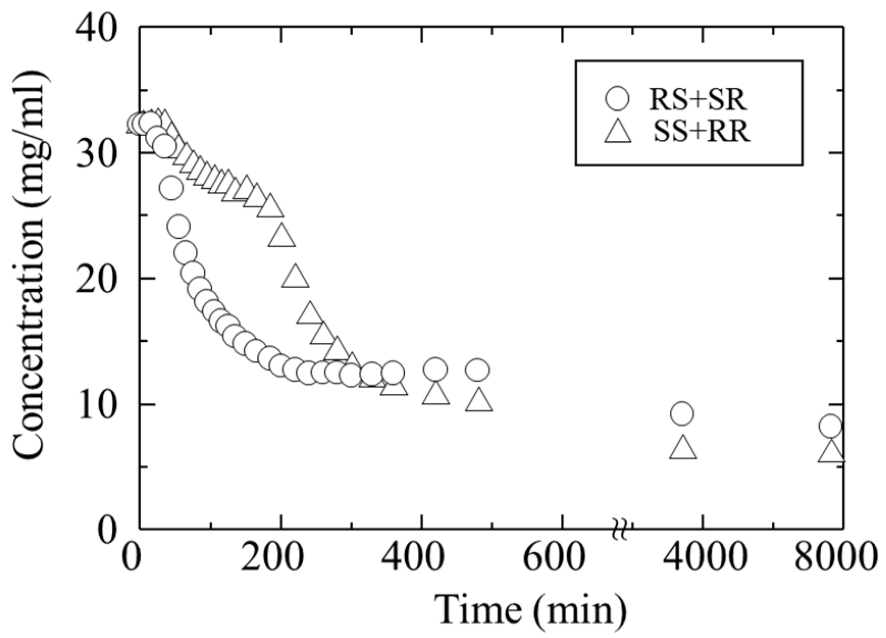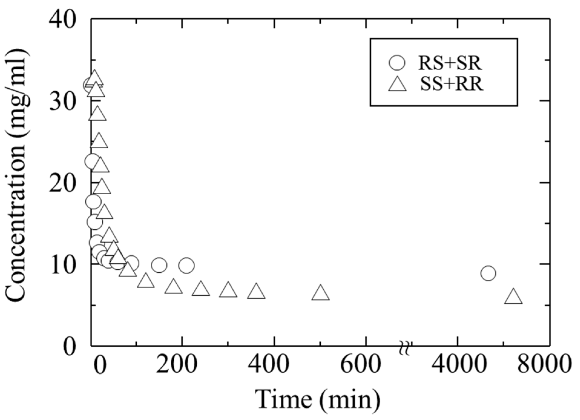 Figure 7 shows the time course of concentration changes when each diastereomer pair (RS/SR and RR/SS) was crystallized individually (their solids correspond to H-form and L-form). The initial concentration of each isomer was 16 mg/mL, corresponding to 32 mg/mL for each pair.