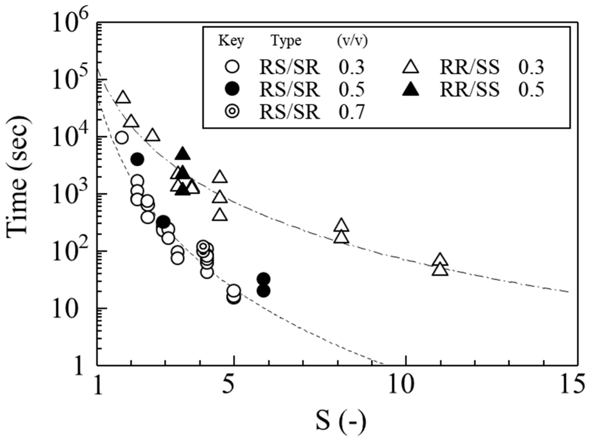 Crystallization from solutions of RS/SR or RR/SS proceeded faster than from mixed solutions containing all four isomers. To quantitatively evaluate the induction time required for the onset of crystallization of RS/SR and RR/SS, experiments were conducted under various conditions. Solutions with different saturation ratios (S = C/Cs) were prepared by adjusting the solvent composition and initial concentration. The induction period—defined as the time from the generation of supersaturation to the appearance of detectable crystal precipitation—was measured.
