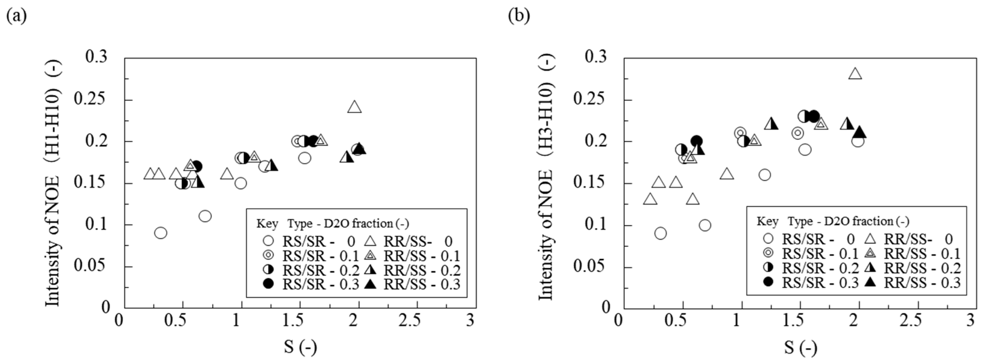 Figure 10a,b show the saturation ratio (S) on the horizontal axis and NOE intensity on the vertical axis, with results obtained for RS/SR and RR/SS at solvent composition of water/(acetone + water) = 0.0, 0.1, 0.2, and 0.3, respectively.