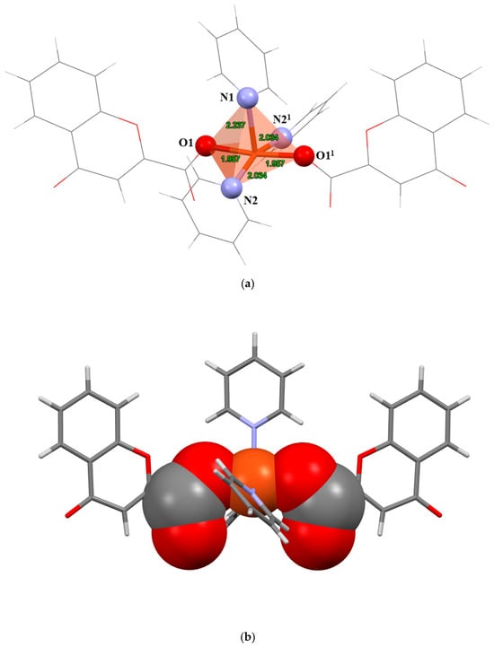 The complex crystallizes in the monoclinic crystal system, space group P 2/n, Z = 4. The molecular structure of the compound is shown in Figure S1, and selected bond lengths and angles are given in Table 2. The Cu(II) ion is coordinated by 2 monodentate chromone-2-carboxylates and 3 pyridine molecules in the distorted square pyramidal geometry (Figure 1a). 2 chromone ligands and 2 pyridine ligands are located on the equatorial position and symmetry related by a 2-fold regular axis. The axial position is occupied by the third pyridine ligand. The τ5 value (Addison parameter) [38] can be used as a measure of five-coordinate geometry. This value indicates whether the coordination compound displays perfect square pyramidal geometry (τ5 = 0) or trigonal bipyramidal (τ5 = 1). The τ5 value for this compound is 0.23, indicating a distorted square pyramidal geometry. The largest deviation from regular geometry is found for N2−Cu1−N21 (159.46(11)°) angle. The bond lengths and angles are in good agreement with previously reported square pyramidal Cu(II) complexes with carboxylate and pyridine ligands [39,40]. The Cu(II) ion, coordinated and uncoordinated O atoms of the carboxylate group form a chelate-like “active site” suitable for substrate binding (Figure 1b).