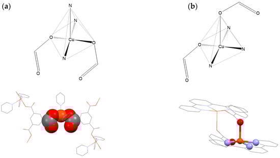 (a) Representation of motifs among Cu(II) five-coordinated compounds with monodentately coordinated carboxylate and N-donor ligands (figures above): (a) chelate-like motif (e.g., BUQKOP) [47]. (b) non-chelate motif (e.g., KEBHIL) [48] (figures below). BUQKOP and KEBHIL are CSD database Refcodes.