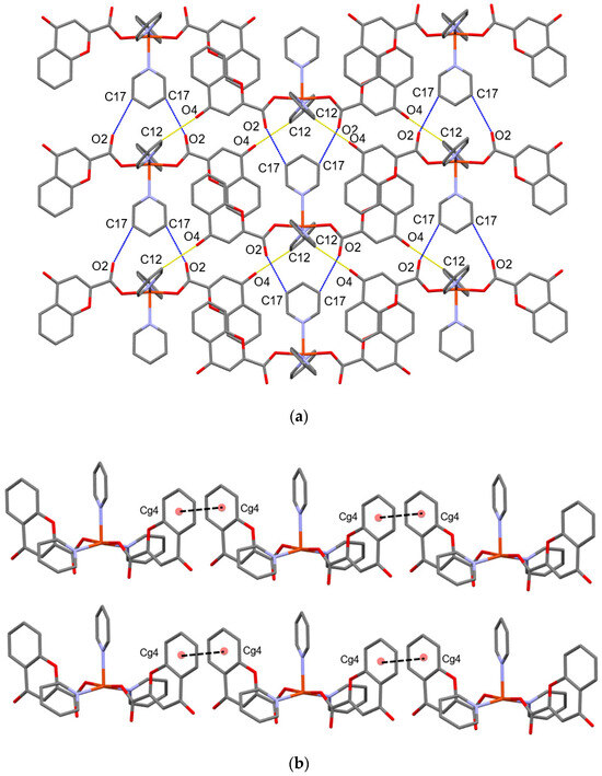 The crystal structure reveals a highly ordered network of interactions between complex molecules, with the copper centers separated by approximately 8.9 Å along the b-axis (far beyond any cuprophilic interactions). In the crystal, the molecules are connected through weak C–H···O, offset π···π, and C−H···π interactions. Adjacent molecules are connected by weak C–H···O interactions (d (C17–H17∙∙∙O2) = 3.105 Å, ∠ (C17–H17∙∙∙O2) = 122.9(2)°) into column-like motifs along b-axis. The adjacent column-like motifs are connected by weak C–H···O (d (C12–H12∙∙∙O4) = 3.117 Å, ∠(C12–H12∙∙∙O4) = 125.5(3)°) and C−H···π (C9–H9∙∙∙Cg3(N2→C15)) interactions into a sheet-like supramolecular assembly approximately along a-axis (Figure 3 and Table 3). The final 3D arrangement of molecules in the crystal is achieved by offset π···π interactions along the a-axis between adjacent benzene moieties of chromone ligands (Figure 3b and Table 3).