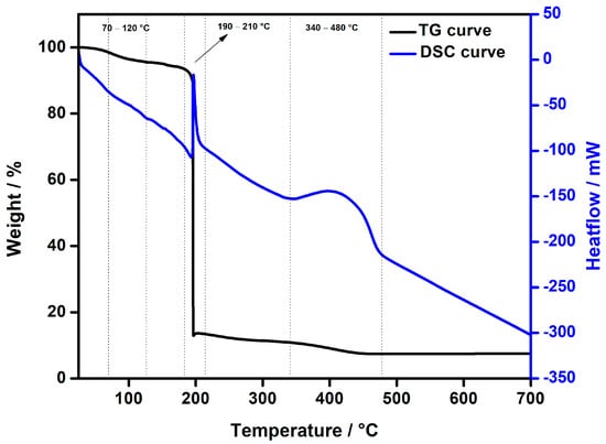 TG/DSC curves of Cu(II) complex heated in an oxygen atmosphere to 700 °C at a rate of 10 °C min−1.