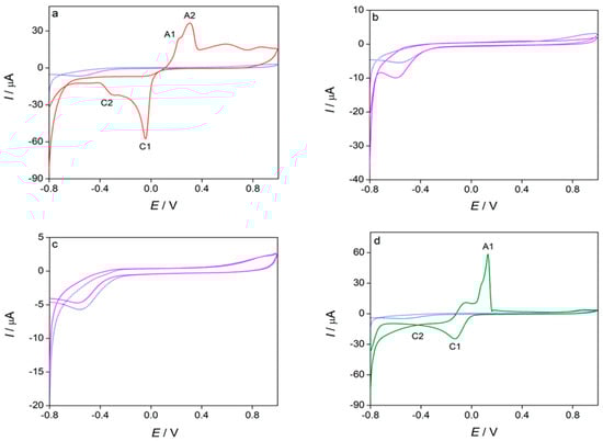 Cyclic voltammograms of blank solution and investigated compounds (c = 1 × 10−3 mol dm−3): (a) Cu(NO3)2·3H2O, (b) ligand L (chromone-2-carboxylic acid), (c) pyridine and (d) complex, recorded at scan rate 100 mV/s (n = 3) in 0.1 mol dm−3 KNO3.