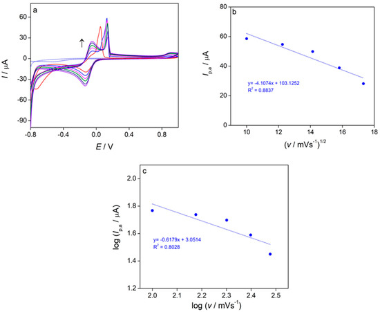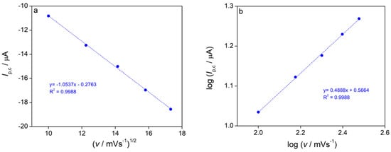 The first cathodic peak (C1), which corresponds to the reduction of Cu2+ to Cu+, is diffusion-controlled. This is confirmed by two key observations: the cathodic peak current (Ip,c) is a linear function of the square root of the scan rate (v1/2) with a high correlation coefficient (R2 = 0.9957) (Figure 8a), and the slope of the log Ip,c vs. log v plot is approximately 0.5 (Figure 8b) [57].