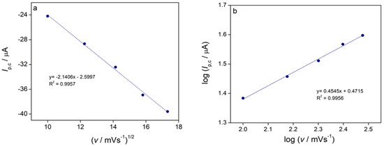 The second cathodic peak (C2) showed that the reduction of Cu+ to Cu0 in the complex is diffusion-controlled process. The linear relationship was observed between the cathodic peak current (Ip,c) and the square root of scan rate (v1/2) (R2 = 0.9988) (Figure 9a) and the slope of the line plotting the logarithm of the cathodic peak current (log Ip,c) vs. the logarithm of the scan rate (log v) was approximately 0.5 (as shown in Figure 9b) [57].