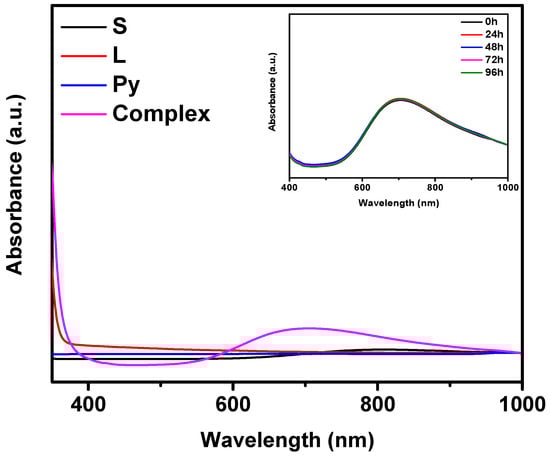 UV-Vis absorption spectra of the individual components (S: copper(II) nitrate trihydrate, L: chromone-2-carboxylic acid, Py: pyridine) and the resulting copper(II) complex, with all components at a concentration of 10−2 mol dm−3, recorded over time. The inset shows the stability of the complex in aqueous solution at different time intervals (0 h, 24 h, 48 h, 72 h, and 96 h). Characteristic absorption maxima for the complex occur at 700 nm.