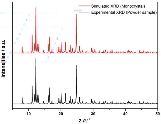 Accurate identification and structural characterization of the sample are essential for ensuring the reliability of biological testing. In this study, a comparative analysis was performed between the experimental powder X-ray diffraction (PXRD) pattern and the simulated XRD pattern of a monocrystal to confirm their structural equivalence (Figure 11). The highly similar peak positions between the two patterns suggest that the powder sample shares the same crystal structure as the monocrystal. The experimental diffraction (black line) shows broader peaks, typical of polycrystalline materials, while the simulated diffraction (red line) exhibits sharper peaks, characteristic of ideal single crystal diffraction. Despite differences in peak sharpness, the congruence in peak positions confirms structural identity between the two forms of the compound. This structural confirmation is vital for biological assays. If the powder sample were structurally different, such as showing polymorphism or phase mixtures, it could introduce uncertainty regarding the biological activity observed. Polymorphs of the same compound may exhibit differences in molecular packing, solubility, and stability, potentially altering biological properties [72]. Therefore, confirming the powder’s structural equivalence to the monocrystal ensures that the biological effects are reliably attributed to the intended compound. Furthermore, this analysis rules out contamination or structural heterogeneity, which could affect the biological results. The structural consistency is crucial in bioinorganic research, particularly in correlating a compound’s molecular structure with its biological activity [73]. By confirming that the powder is identical to the monocrystal, we ensure robust and reproducible results, which are critical for the development of therapeutic agents.