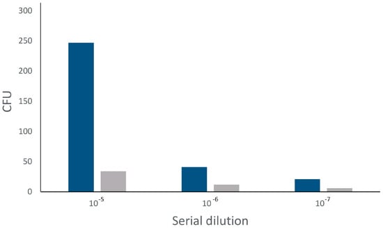 Abundance of colony forming units after incubation of E. coli with active compound. Blue = controls, grey = copper(II) complex.