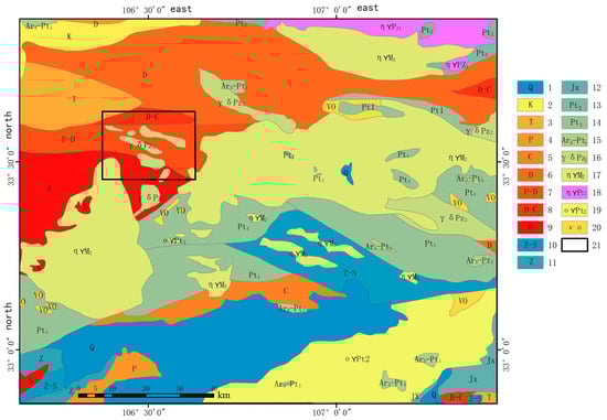 Simplified geological map (modified from [15]). 1. Quaternary. 2. Paleogene. 3. Triassic. 4. Permian. 5. Carboniferous. 6. Devonian. 7. Permian-Devonian. 8. Devonian-Carboniferous. 9. Silurian. 10. Sinian-Silurian. 11. Sinian. 12. Suxian System. 13. Mesoproterozoic. 14. Paleoproterozoic. 15. Neoarchean-Paleoproterozoic. 16. Indosinian granodiorite (Mesozoic). 17. Variscan quartz diorite (Late Paleozoic). 18. Caledonian monzogranite (Early Paleozoic). 19. Yangtze Early Period plagioclase granite (Late Proterozoic). 20. Gabbro-norite. 21. Study Area.