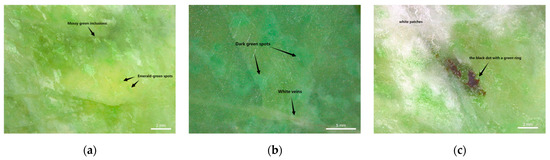 Surface characteristics of the samples. (a) Mossy green inclusions and emerald-green spots. (b) Dark green spots and white veins (c) White clouds and a black dot with a green ring.