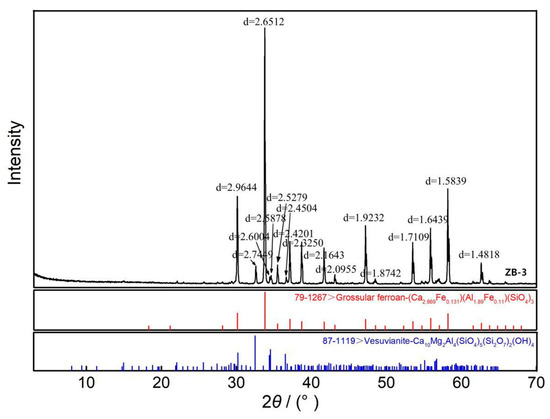 Analyses were performed on the pure white matrix of the white hydrogrossular jade sample ZB-3. The diffraction data of the sample were processed using MDI Jade 6.5 software, and the resulting diffraction pattern was compared with standard reference patterns from the ICDD database using PDF cards for phase identification (Figure 4). The major diffraction peaks of the hydrogrossular jade sample ZB-3 match well with the reference pattern of grossular (PDF#79-1267, Grossular ferroan), while partial peak correspondence is also observed with vesuvianite (PDF#87-1119, Vesuvianite). These results indicate that the pure white matrix of ZB-3 is primarily composed of grossular, with minor amounts of vesuvianite, which is consistent with observations under polarizing microscopy. The sharp diffraction peaks indicate a highly crystalline and fine-grained nature of the sample. The corresponding diffraction data are provided in Table 2.