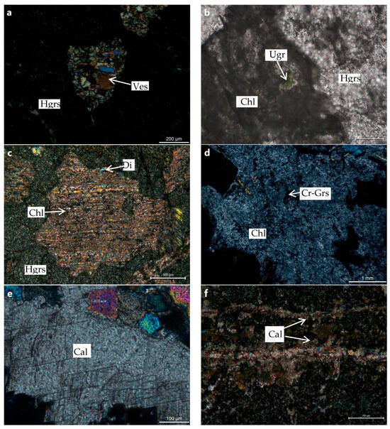 Polarizing micrographs of the samples. (a) Hydrogrossular occurs in the matrix alongside relatively larger vesuvianite grains (+). (b) Uvarovite exhibiting an emerald-green coloration (−). (c) Diopside grains are replaced by hydrogrossular along the cleavage planes, with partial alteration to chlorite (+). (d) Chlorite and Cr-bearing grossular. (e) Coarse-grained calcite (+). (f) Calcite veinlets (+).