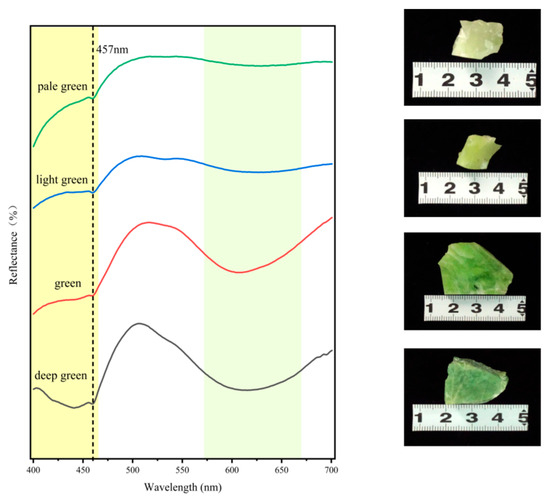 For this study, four distinct regions of the jade exhibiting gradational coloration from light to dark were selected and subjected to ultraviolet–visible (UV-Vis) spectroscopic analysis (Figure 7). Two strong and broad absorption bands are observed in the ranges of 400–460 and 570–670 nm, accompanied by a weak absorption peak at 457 nm. These features indicate selective absorption of violet-blue and yellow-orange light, resulting in the green coloration of the sample. The absorption band observed between 400 and 460 nm is attributed to electronic transitions between split energy levels resulting from the division of the 5D spectroscopic term in the 3d6 electron configuration of Fe2+. In an octahedral field, the only allowed electronic transition for Fe2+ is 5T2g → 5Eg [19]. The absorption band at 570–670 nm is primarily attributed to the typical spin-forbidden d-d transition of Cr3+ in octahedral coordination, specifically 4A2g(F) → 4T2g(F), superimposed on the absorption resulting from charge transfer between Fe2+ and Fe3+ [20]. The shoulder peak at 457 nm is attributed to energy level splitting caused by the octahedral distortion of Cr3+ [21,22]. Therefore, the primary chromogenic elements in Zibai Jade are Cr3+ and Fe.